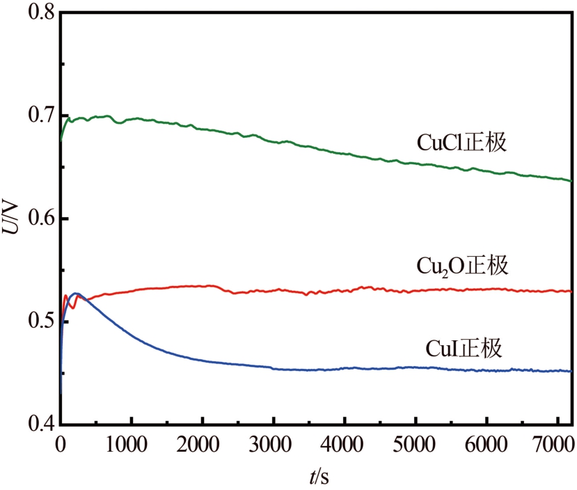 (2)CuCl和Cu2 O正极激活时间均为20 s,而CuI正极激活时间超过2 500 s.