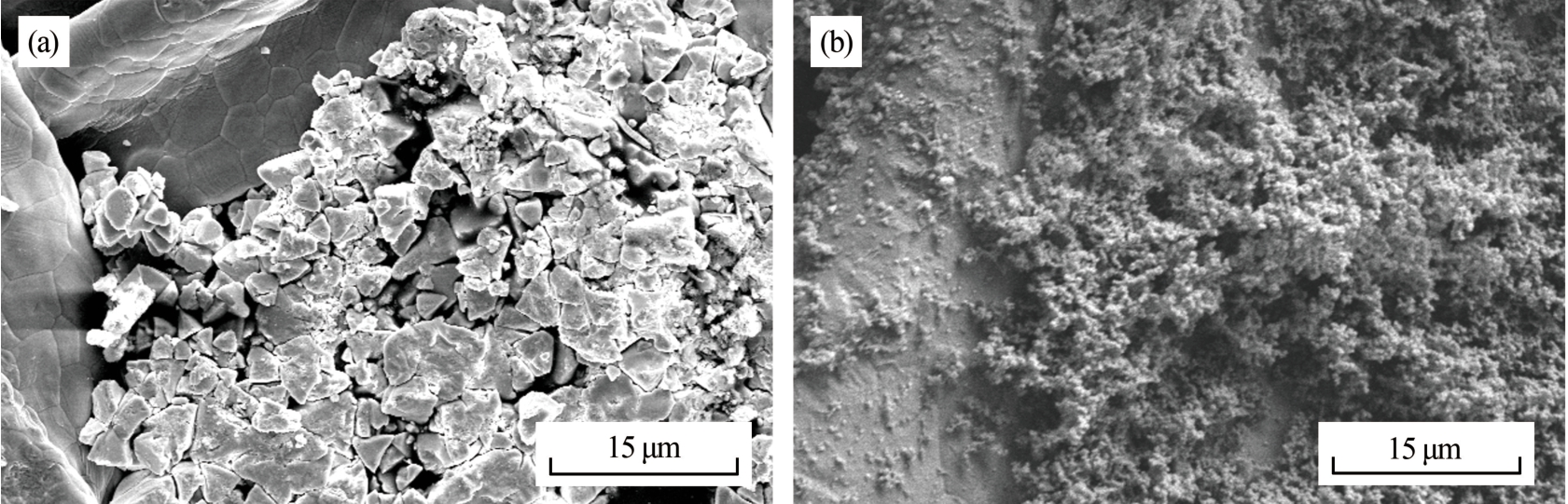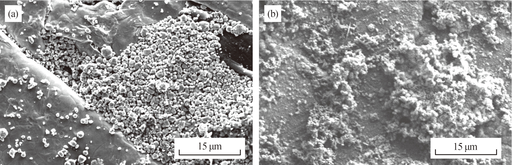 Fig.5 SEM images of CuCl cathode in alum inum-seawater activated battery before and after discharge
