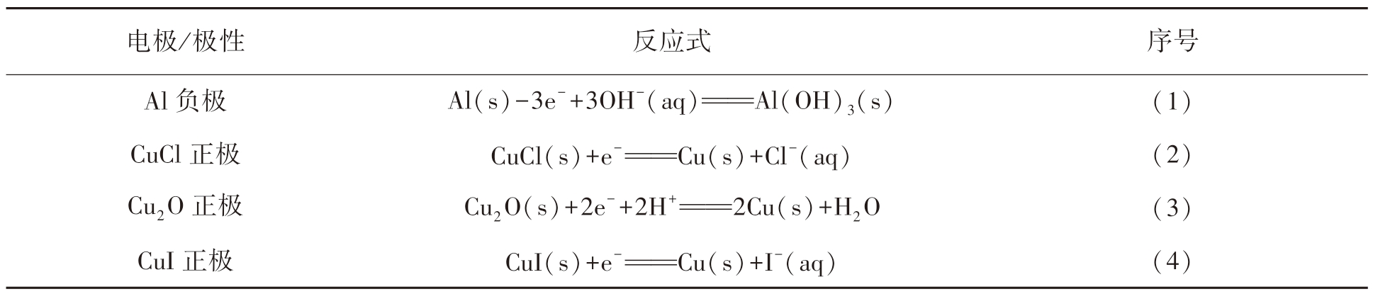电极/极性反应式序号Al负极Al(s)-3e-+3OH-(aq)==Al(OH)3(s)(1)CuCl正极CuCl(s)+e-==Cu(s)+Cl-(aq)(2)Cu2 O正极Cu2 O(s)+2e-+2H+==2Cu(s)+H2 O(3)CuI正极CuI(s)+e-==Cu(s)+I-(aq)(4)