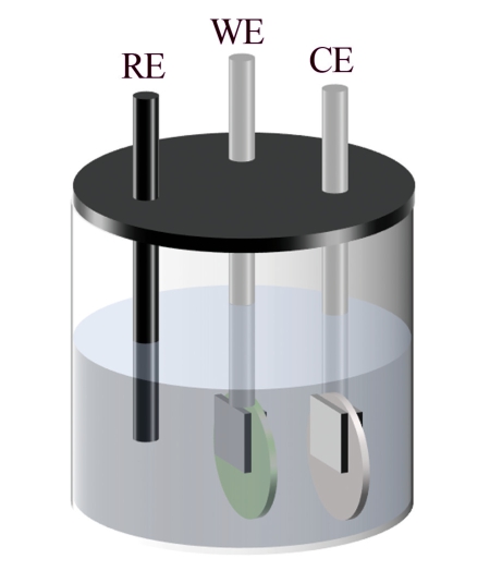 分别使用扫描电子显微镜(SEM,捷克FEI,Quanta 250 FEG)和X射线衍射仪(XRD,德国布鲁克AXS,D8 DISCOVER)对电极形貌及物相进行表征.使用电化学工作站(上海辰华,CHI760e),在25℃下以1 A恒电流持续放电2 h,对电池正极性能进行测试,实验装置图如图1所示.图中工作电极WE为制备的铜化合物正极,对电极CE为铂片(Pt),参比电极RE为饱和甘汞电极(SCE).