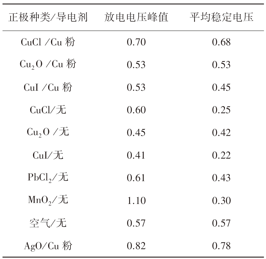 正极种类/导电剂放电电压峰值平均稳定电压CuCl/Cu粉0.70 0.68 Cu2 O/Cu粉0.53 0.53 CuI/Cu粉0.53 0.45 CuCl/无0.60 0.25 Cu2 O/无0.45 0.42 CuI/无0.41 0.22 PbCl2/无0.61 0.43 MnO2/无1.10 0.30空气/无0.57 0.57 AgO/Cu粉0.82 0.78
