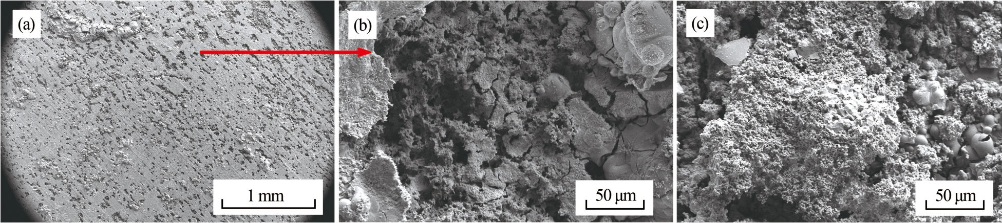 (a)—铝负极表面及其点蚀坑(CuCl正极);(b)—点蚀坑内部放大图(Cu2 O正极);(c)—含铜点蚀坑内部放大图(CuI正极).