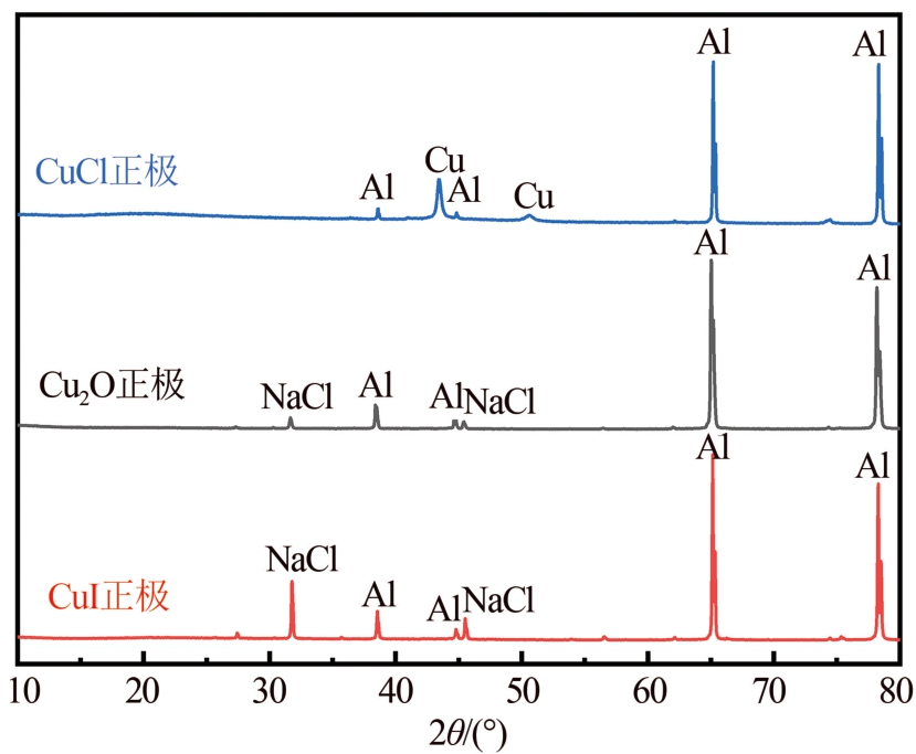 结合学术界的成果,分析CuCl、Cu2 O、CuI这3种材料具备较好的综合物理化学性质.因此,本文中以Al为负极,CuCl、Cu2 O、CuI为正极,模拟海水为电解液,对比3种材料的性能差异,研究铝-海水激活电池的性能.