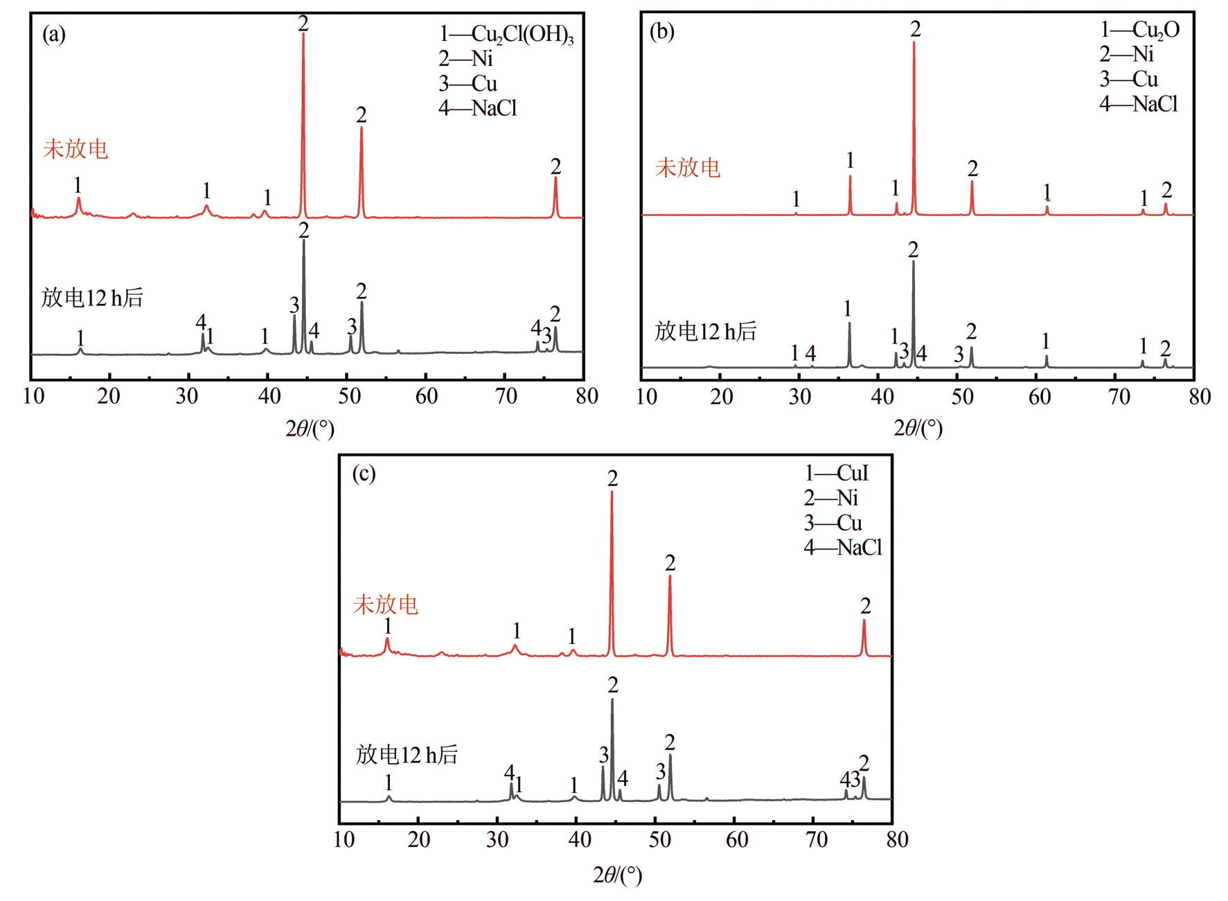 将充分放电后的正极置于干燥箱中干燥,对放电前后的3种正极片(CuCl、Cu2 O、CuI)分别进行XRD测试,结果如图3所示.图3(a)为CuCl正极片在放电前和放电后12 h的物相分析图,由于CuCl自身会与氧气发生氧化反应,因此,放电前出现了CuCl氧化产物碱式氯化铜[Cu2 Cl(OH)3] 的特征峰,同时还有集流体Ni的特征峰.放电后,除了Cu2 Cl(OH)3和Ni外,在正极片上还检测出明显的Cu的特征峰,这是电池放电过程中正极反应的产物.