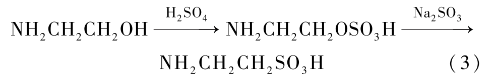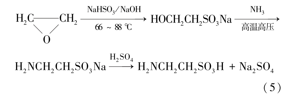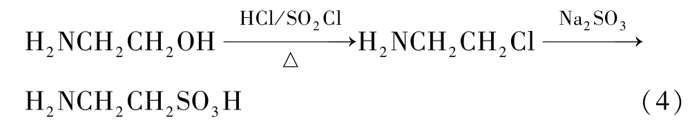 乙醇胺先与盐酸氯化生成2-氯乙胺盐酸盐,再与亚硫酸钠磺化生成牛磺酸,主要反应方程式如(4)所示。 采用浓盐酸氯化时,实验室小试的氯化和磺化收率可分别达到91.3%和94.0%,但氯化时间长(>50 h),且反应中盐酸浓度降低后需要补充干氯化氢气体使其重新饱和,导致工业生产工序复杂、成本提高,而且工业化生产中牛磺酸收率远低于实验室小试(约48%)。 1982年,日本三井东压化学公司采用浓盐酸,在100~140 ℃和2 MPa条件下氯化24 h,2-氯乙胺盐酸盐收率78.2%、质量分数81%;改用干燥氯化氢气体,在100~140 ℃和0.3~0.7 MPa条件下氯化36 h,2-氯乙胺盐酸盐收率提高,质量分数98.8%。 氯化-磺化法中最有发展前途的是采用干氯化氢气体,该氯化反应容易进行、反应迅速,温度宜控制在150~159 ℃,反应时间22~24 h,反应过程中及时脱水有利于提升转化率;磺化反应温度40~90 ℃,时间4 h,工业装置的牛磺酸收率达到80%以上。