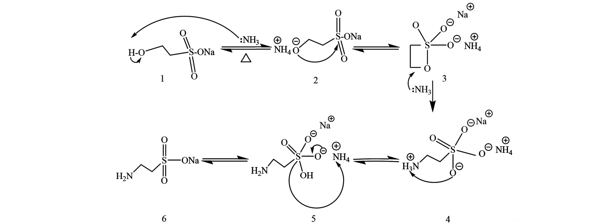 因此,非均相氨解催化剂的开发在理论和工程实践上更有意义。 铁系/铝系金属盐、NiO/CeO2、稀土氧化物等非均相氨解催化剂,经母液循环套用后,可使收率提升至90%~95%,但氨解反应条件仍然较为严苛(250~270 ℃、10~20 MPa)。 氨水络合离子催化剂可显著降低氨解反应条件(150~200 ℃、6~11 MPa),2-羟乙基磺酸钠转化率可达98%以上,牛磺酸总收率超过92%以上[13]。 江阴华昌食品添加剂有限公司发现负载镍的活性氧化铝催化剂可将氨解压力降至 3 ~ 8 MPa[14]。 择型催化剂[Zr2MoO4(PO4)2、Pd-C/Al2O3、BaCaTiO4、BaTi6Co6O19等]特有的孔道结构限制了氨解反应中大分子副产物“二牛”(二取代牛磺酸钠)、“三牛”(三取代牛磺酸钠)等的生成,提升了氨解反应选择性,工艺条件更加温和(130~150 ℃;5~9 MPa、20~60 min)、转化率高(2-羟乙基磺酸钠转化率≥98%),牛磺酸钠单程收率高(90.0% ~96.0%)[15]。 但该类择形催化剂制备过于复杂,增加了生产成本。 虽有专利报道基于羟乙基磺酸碱金属盐和乙烯基磺酸碱金属盐为原料,可将氨解副产“二牛”、“三牛”转化为牛磺酸钠,使牛磺酸总产率高达95%,但未见其工业化。 此外, N, N-二取代氨基乙磺酸系催化剂(CN110252395A[16])可显著提高氨解收率、抑制杂质产生、减少氨的用量。