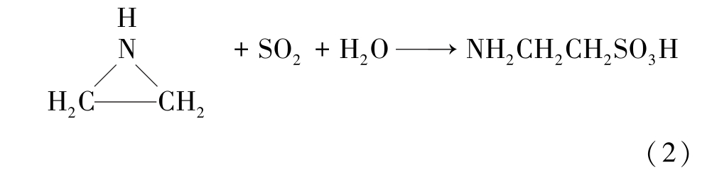 乙撑亚胺法以乙撑亚胺为原料,与二氧化硫、水(或亚硫酸氢铵或硫酸)一步反应即得牛磺酸,主要反应方程式如(2)所示。 该工艺主要优点是反应条件温和、产率高(80.0% ~ 88.9%)、没有副产物(可省去乙醇胺法中的脱盐操作和设备、也无元明粉等固废)、产品纯度高、投资少、成本低;主要缺点是原料乙撑亚胺有剧毒且沸点低(57 ℃左右)易挥发、易聚合爆炸。 乙撑亚胺法最早由美国联合碳化公司在80年代初开发成功并进行工业化生产:乙醇胺经气相催化脱水、环合制得乙撑亚胺,再与硫酸开环加成制得牛磺酸。 随后日本催化剂化学公司改进了其工艺,开发出高效的Cs0.9Ba0.1P0.8型乙醇胺脱水环合催化剂,并用惰性的氮气稀释乙撑亚胺气体,在5 ℃条件下与亚硫酸氢铵溶液反应生产牛磺酸,收率可达84%。 理论上讲,乙撑亚胺法生产牛磺酸最具发展前途,但目前我国对乙撑亚胺法工艺的研究较少。