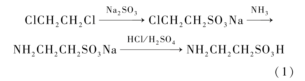 二氯乙烷法以1,2-二氯乙烷为原料,先与亚硫酸氢钠发生磺化反应得到氯乙基磺酸钠,再与氨水进行氨解反应得到氨基乙磺酸钠,再经盐酸或硫酸酸化制得牛磺酸,主要反应方程式如(1)所示。 该工艺主要缺点是原料1, 2-二氯乙烷有剧毒、工艺步骤较多、废水量大、氨解反应需要高压且副产物多、氨解反应温度高且需严格控制,导致氨解设备要求高、投资大、生产成本高。 此外,该工艺酸化会产生大量的固废元明粉。 二氯乙烷法曾在国外成功工业化生产,也是我国最早实现牛磺酸工业化生产的工艺路线,但目前已基本被放弃。