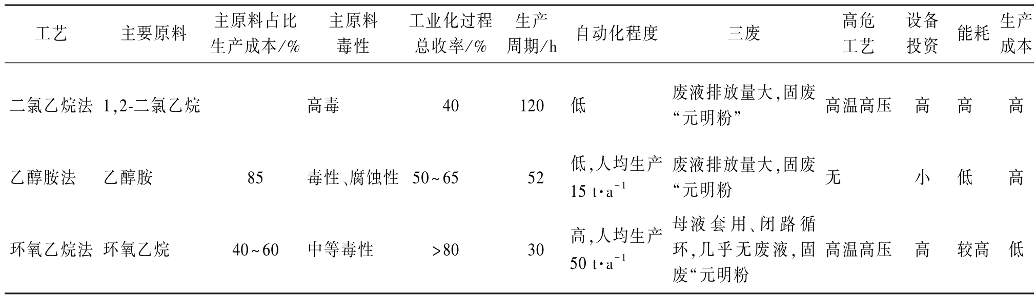 工艺 主要原料 主原料占比生产成本/%主原料毒性工业化过程总收率/%周期/h 自动化程度 三废 高危工艺生产设备投资 能耗 生产成本二氯乙烷法1,2-二氯乙烷 高毒 40 120 低 废液排放量大,固废“元明粉” 高温高压 高 高 高乙醇胺法 乙醇胺 85 毒性、腐蚀性 50~65 52 低,人均生产15 t·a-1废液排放量大,固废“元明粉 无 小 低 高环氧乙烷法 环氧乙烷 40~60 中等毒性 >80 30 高,人均生产50 t·a-1母液套用、闭路循环,几乎无废液,固废“元明粉高温高压 高 较高 低