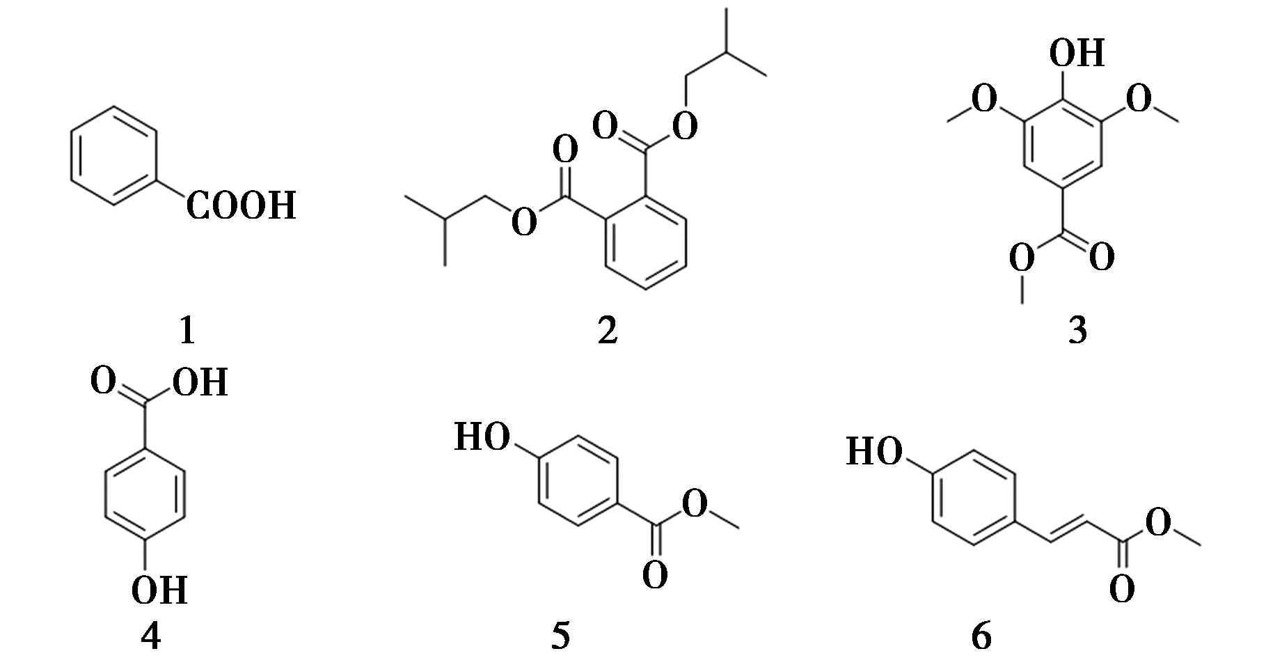 文献中共报道了6个从簕欓花椒的根茎中分离得到的芳香类成分,分别为benzoic acid(1)、邻苯二甲酸二异丁酯(diisobutyl phthalate,2)、methyl syringate(3)、对羟基苯甲酸(p-hydroxybenzoic acid,4)、methyl 4-hydroxybenzoate(5)、methyl(E)-p-hydroxycinnamate(6),如图7所示[9,10,12,13]。