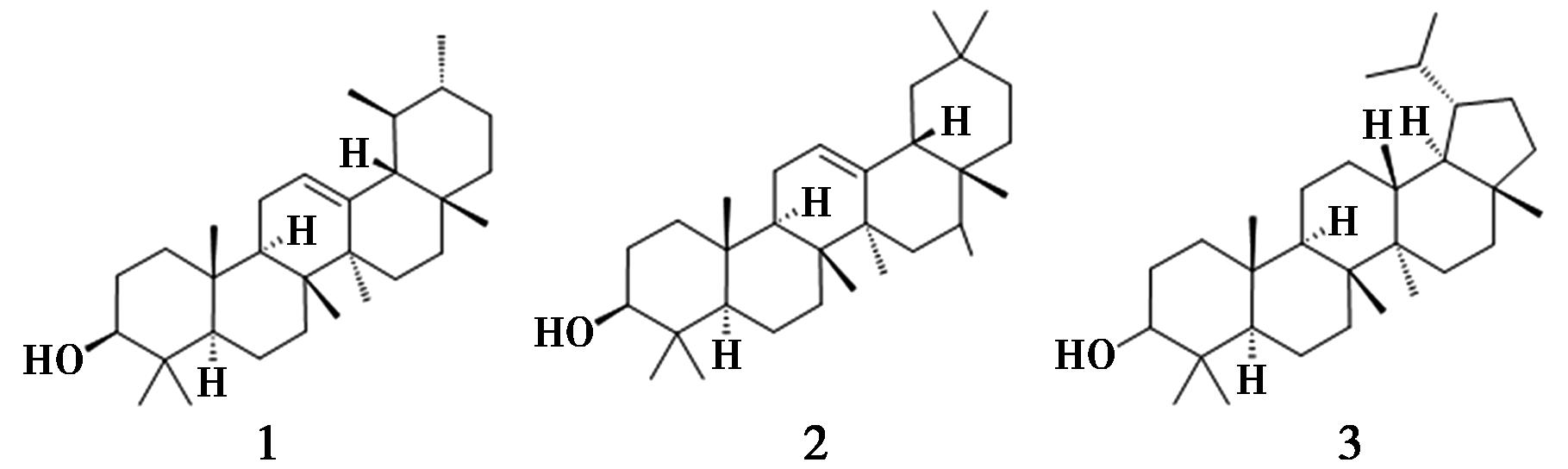 文献中共报道了3个从簕欓花椒的根茎中分离得到的三萜类成分,分别为α-香树脂醇(α-amyrin,1)、β-香树脂醇(β-amyrin,2)、羽扇豆醇(lupol,3),如图4所示[12,13]。