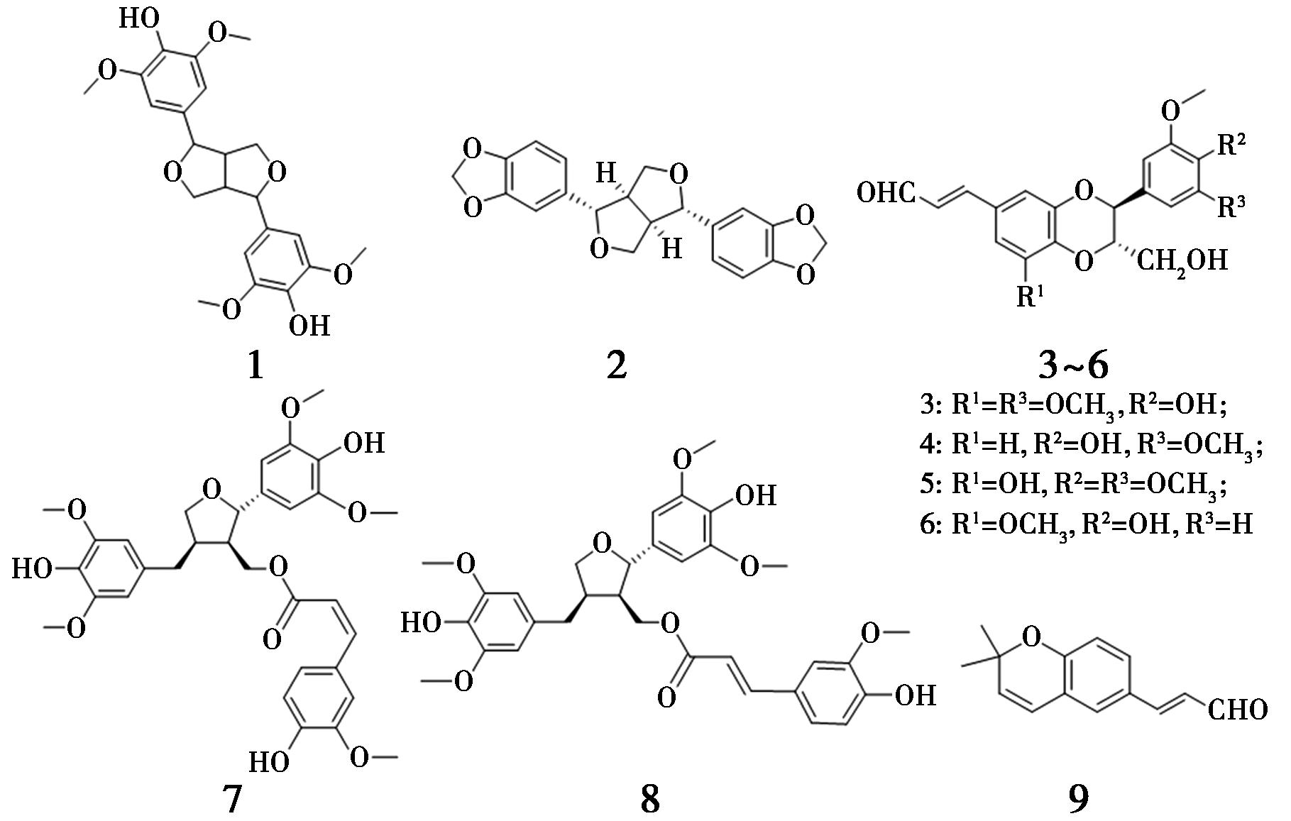 截至2023年9月,文献中共报道了9个从簕欓花椒的根茎中分离得到的木脂素类成分,分别为丁香脂素(syringaresinol,1)、芝麻素(sesamin,2)、(7′S,8′S)-bilagrewin(3)、(7′S,8′S)-5-demethoxybilagrewin(4)、(7′S,8′S)-5-O-demethyl-4′-O-methylbilagrewin(5)、(7′S,8′S)-nocomtal(6)、(+)-9′-O-(Z)-feruloyl-5,5′-dimethoxylariciresinol(7)、(+)9′-O-(E)-feruloyl-5,5′-dimethoxylariciresinol(8)、(E)-3-(2,2-dimethyl-2H-chromen-6-yl)prop-2enal(9),如图3所示[9,12]。