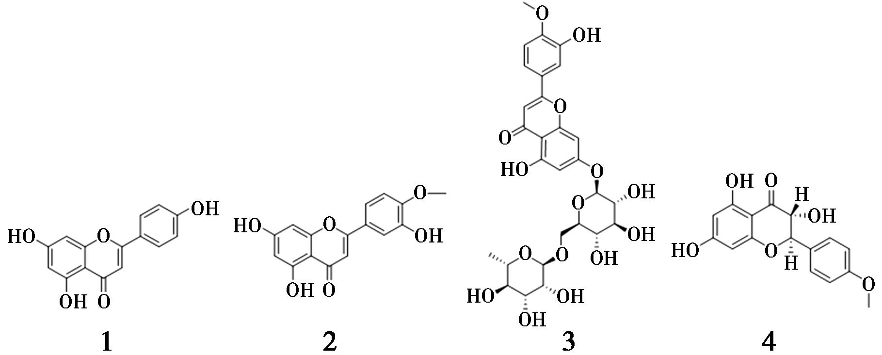 文献中共报道了4个从簕欓花椒的根茎中分离得到的黄酮类成分,分别为diosmetin(1)、apigenin(2)、香叶木苷(diosmin,3)、二氢山柰素(dihydrokaempferide,4),如图5所示[9,10,14]。