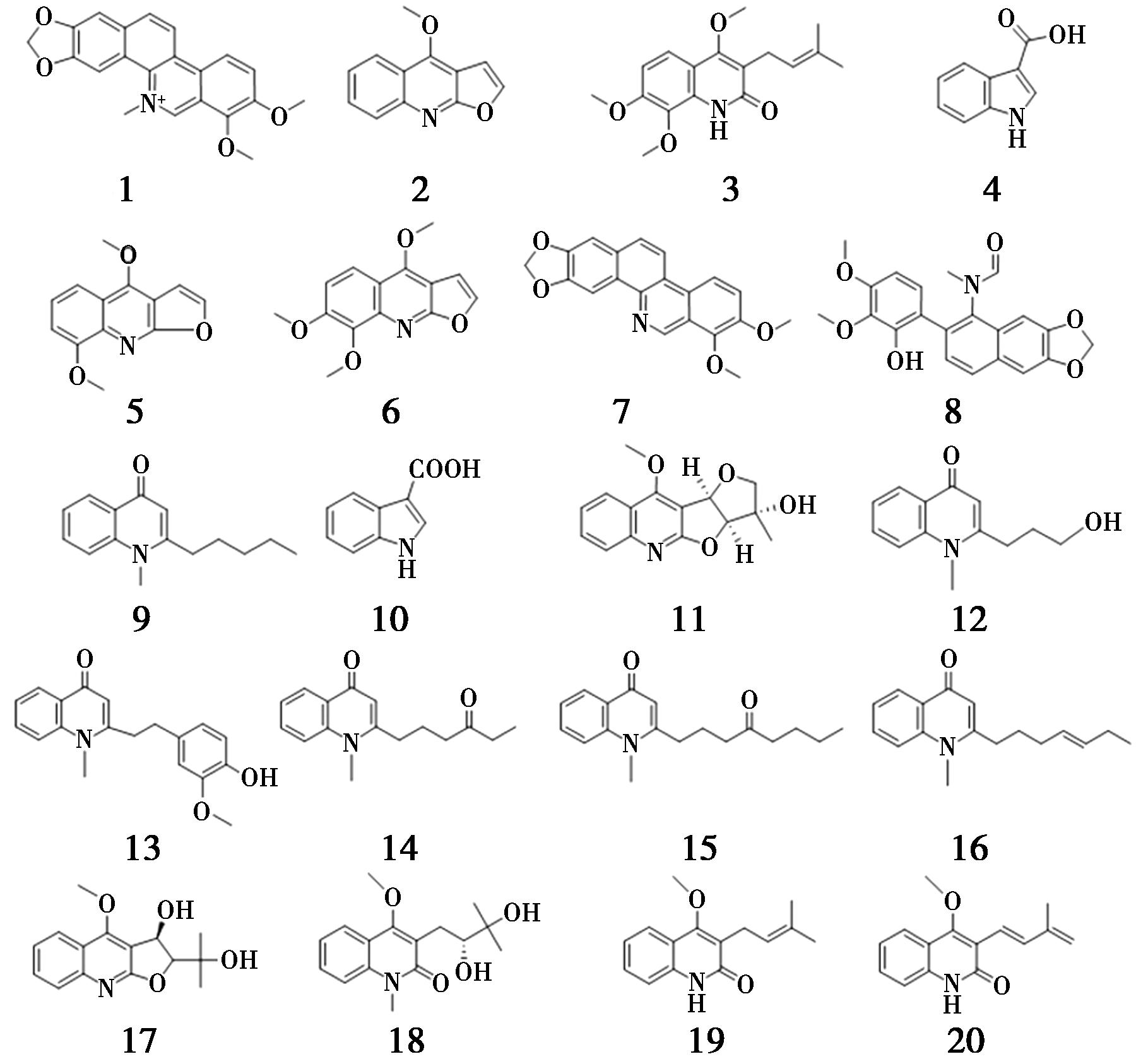 截至2023年10月,文献中共报道了20个从簕欓花椒的果实、叶和根茎中分离得到的生物碱类成分,分别为白屈菜季铵碱(chelerythrine,1)、白鲜碱(dictamine,2)、前茵芋碱(preskimmianine,3)、3-吲哚甲酸(1H-indole-3-carboxylicacid,4)、γ-崖椒碱(γ-fagarine,5)、茵芋碱(skimmianine,6)、norchelerythrine(7)、arnottianamide(8)、1-methyl-2-pentylquinolin-4(1H)-one(9)、indole-3-carboxylic acid(10)、avicenine A(11)、avicenine B(12)、avicenine C(13)、avicenine D(14)、avicenine E(15)、avicenine F(16)、(+)-myrtopsine(17)、(-)-edulinine(18)、4-methoxy-3-(3-methylbut-2-en-1-yl) quinolin-2(1H)-one(19)、(E)-4-methoxy-3-(3-methylbuta-1,3-dien-1-yl)quinolin-2(1H)-one(20),如图2所示[7,8,10-13]。