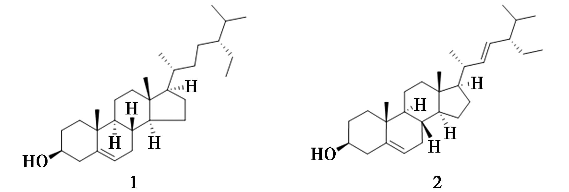 文献中共报道了2个从簕欓花椒中分离得到的甾体类成分,分别为β-谷甾醇(β-sitosterol,1)、stigmasterol(2),如图6所示[8,10]。