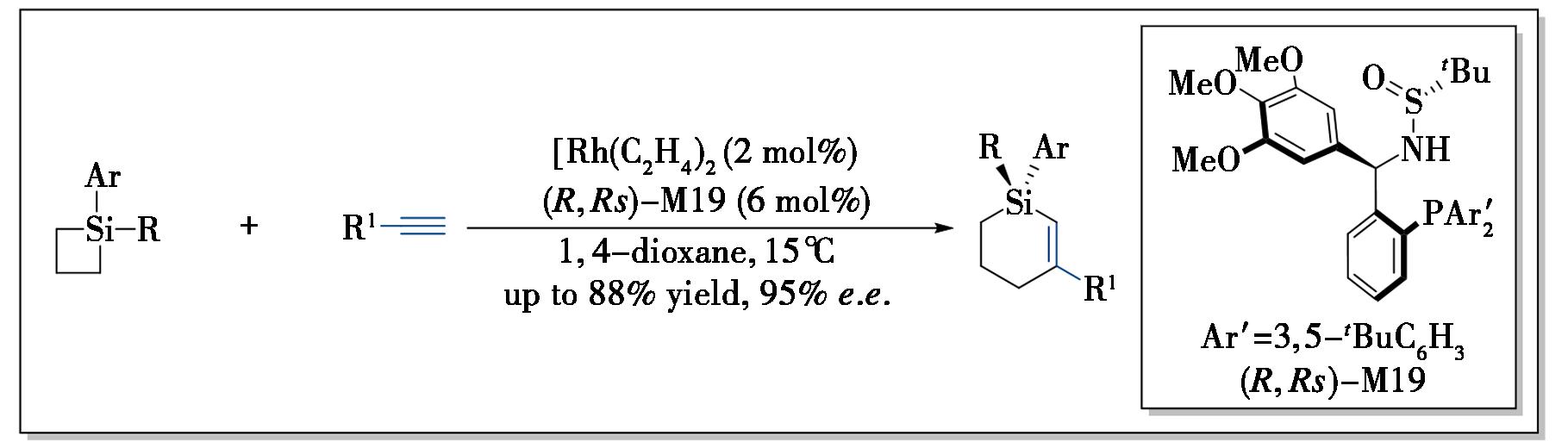 硅杂环丁烷(SCBs)与炔烃的不对称扩环反应已成为构建硅手性化合物的重要策略。2024年,本课题组报道了铑催化SCBs与端炔的不对称环化反应,该方法借助新型Ming-Phos配体M19,以优异的对映选择性高效构建了一系列结构多样的手性硅杂环化合物(图9)[42]。研究表明,在Ming-Phos膦配体中引入富电子且空间位阻较大的3,5-二叔丁基苯基基团可显著提升反应的对映选择性。该体系展现出良好的底物适应性与官能团兼容性,产物可通过催化氢化、烯丙基溴化、氧化等反应实现多样化衍生化,进一步转化为多种高附加值手性硅化合物。基于实验结果,本课题组提出了可能的催化循环:Rh(Ⅰ)-M19配合物首先与端炔配位,随后对SCBs发生氧化加成生成五元环铑中间体;炔烃迁移插入形成铑硅杂环庚烯中间体;最后经还原消除释放产物并再生催化剂。该工作不仅为手性硅化合物的合成提供了新方法,也为Ming-Phos配体在不对称催化中的应用开辟了新方向。