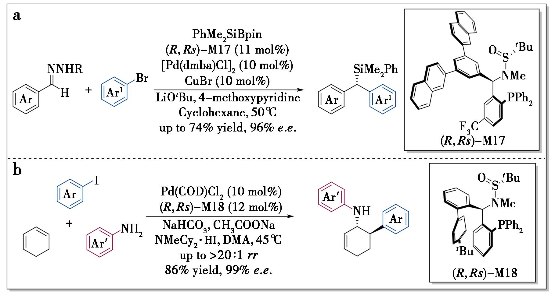a.钯催化N-磺酰腙、芳基溴与硅基硼酯的不对称三组分反应[36];b.钯催化芳基碘化物、苯胺与1,3-环己二烯的不对称三组分反应[41]