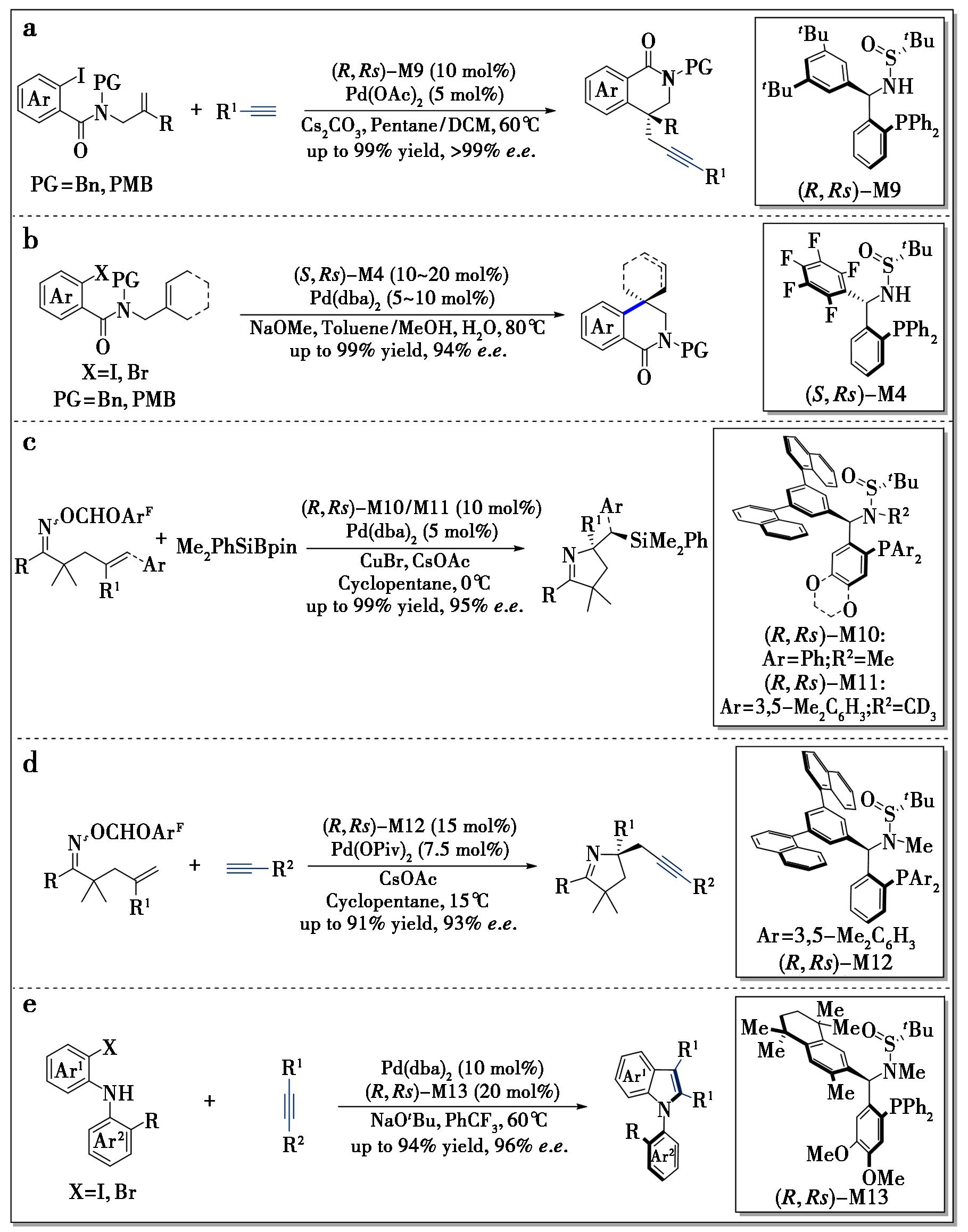 通过烯烃分子内碳钯化反应形成瞬时σ-烷基钯物种以引发交叉偶联反应,已成为合成取代内炔烃的有效策略。然而,受限于底物的外消旋化或配体活性不足,实现此类反应的不对称合成仍颇具挑战性。2020年,本课题组实现了钯催化烯烃与端炔的分子内Heck/Sonogashira反应,成功合成了具有炔丙基取代全碳季碳立体中心的手性苯并稠杂环化合物(图6a)[22]。这一成果的实现依托于所开发的由钯配合物与配体M9构成的高效催化体系。利用该方法,多种N-烯丙基羧酰胺被成功应用,以高对映选择性制得3,4-二氢异喹啉-1(2H)-酮衍生物。值得注意的是,该转化需要使用带有大位阻3,5-二叔丁基苯基的Ming-Phos配体,以戊烷和二氯甲烷的混合体系为溶剂,且无需外加铜作为共催化剂。