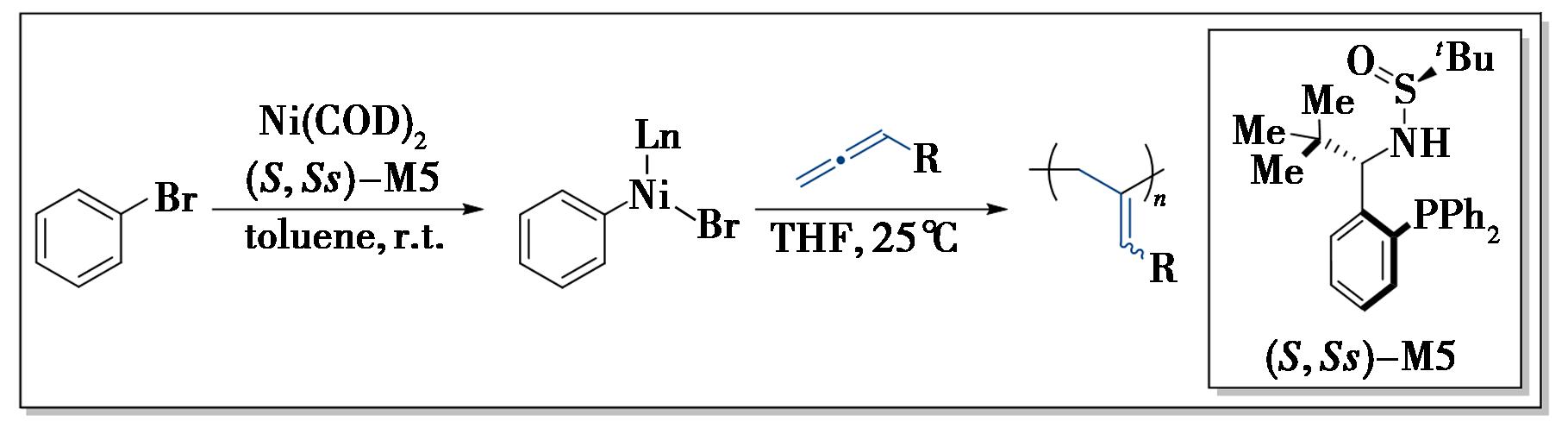 聚丙二烯因其主链或侧基含有的不饱和键,成为构建功能材料极具吸引力的合成前体之一。然而,聚丙二烯的高区域选择性合成仍面临挑战。2019年,Wu等[44]开发了一种新型镍(Ⅱ)催化剂,该催化剂以M5为配体,能够高效引发多种丙二烯单体的聚合反应,且反应速率快,具有可控特征。利用该催化剂,可高产率获得结构明确的聚丙二烯,其摩尔质量(Mn)可控,摩尔质量分布(Mw/Mn)较窄。此外,镍(Ⅱ)/M5催化剂对丙二烯单体的累积双键表现出优异的区域选择性,丙二烯单体聚合的2,3-区域选择性高达>99.9%。值得注意的是,以镍(Ⅱ)/M5为引发剂时,含烷基、烷氧基、取代苯基等不同官能团的多种单体均可有效聚合,得到具有更高2,3-区域选择性的聚丙二烯。