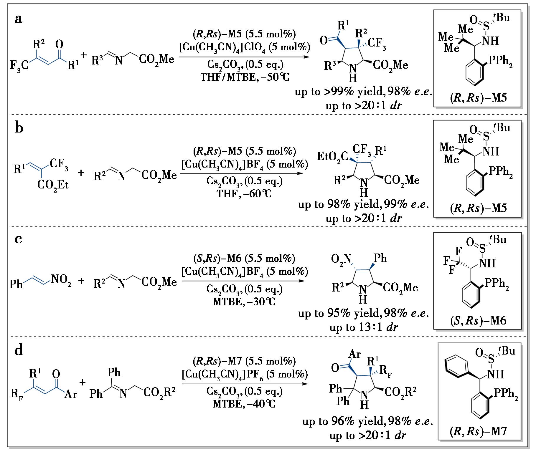 a、b、c、d分别为甲亚胺叶立德与β-三氟甲基-β,β-双取代烯酮[11]、甲亚胺叶立德与α-三氟甲基-α,β-不饱和酯[12]、甲亚胺叶立德与硝基烯烃[13]、甘氨酸酮亚胺与β-三氟甲基-β,β-双取代烯酮[15]的不对称环加成反应