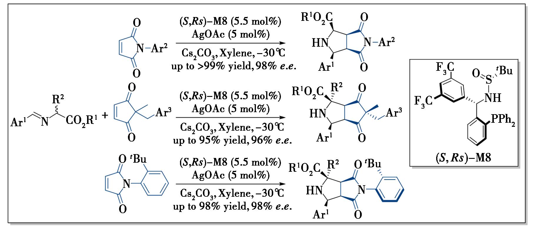 鉴于高度取代吡咯烷的重要性,开发适用于不对称1,3-偶极环加成反应的新型催化体系(尤其是采用高效简洁手性配体的体系且兼容广谱官能团)始终是研究热点。2019年,本课题组的研究表明,新开发的带有3,5-双(三氟甲基)苯基取代基的Ming-Phos配体M8在银催化不对称[3+2]环加成反应中表现出卓越活性[16]。该反应体系中,甲亚胺叶立德与马来酰亚胺、环戊烯-1,3-二酮及N-(2-叔丁基苯基)马来酰亚胺发生反应,能在温和条件下以良好产率及优异对映选择性,制备多种高官能团化的双环吡咯烷衍生物。