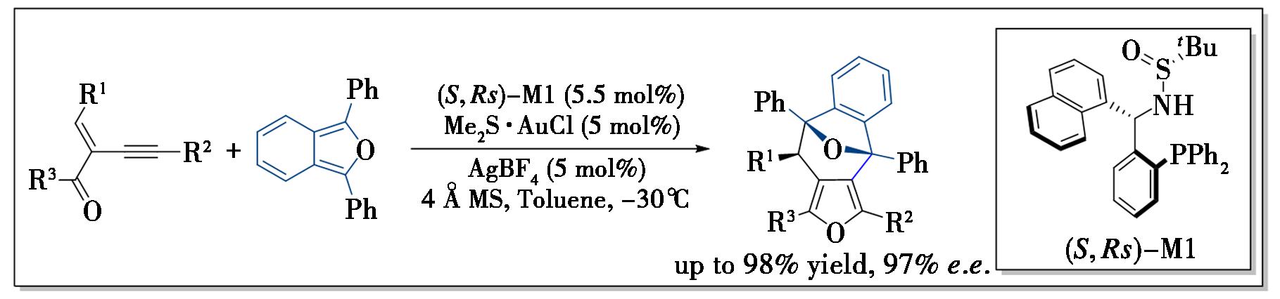2018年,本课题组报道了一例以Ming-Phos配体衍生的金催化体系,用于烯炔酮与3-苯乙烯基吲哚的不对称分子间[3+2]环加成反应(图2b)[7]。该转化能以优异收率和高对映选择性构建吲哚基取代的环戊并[c]呋喃——这类结构单元在天然产物及药物分子中广泛存在。研究中的关键发现是水对反应效率具有显著抑制作用,因此需在严格无水条件下进行。该合成方法的特点在于:反应条件温和且操作简便,底物适用范围广泛且起始原料易于获取,同时对非对映选择性和对映选择性展现出优异的调控能力,凸显了其在杂环骨架构建中的合成实用价值。