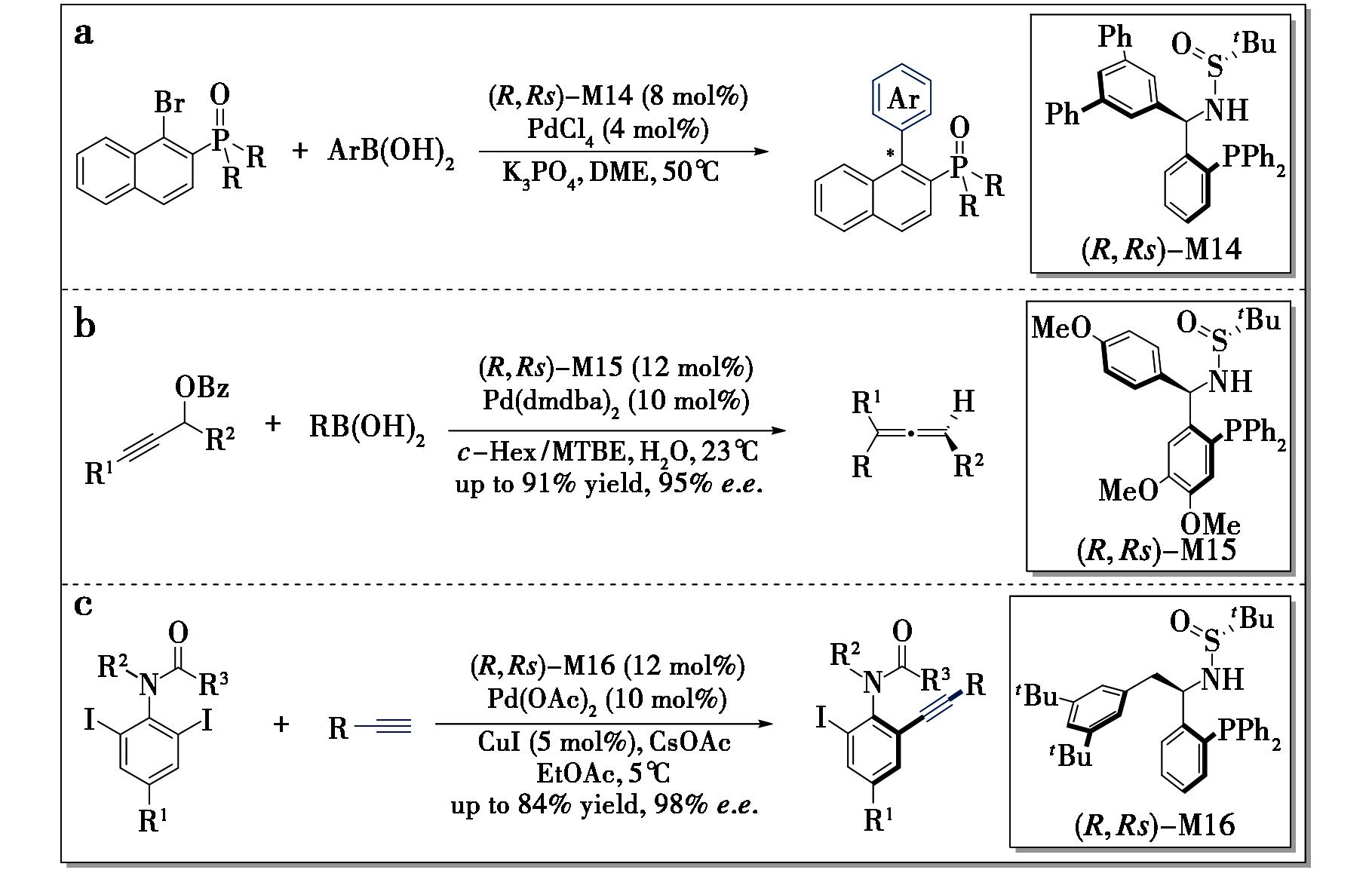 a.不对称Suzuki偶联反应制备轴手性联芳基单氧化膦[27];b.炔丙醇衍生物与有机硼酸的不对称偶联反应[28];c.去对称Sonogashira交叉偶联反应制备轴手性苯胺类化合物[31]