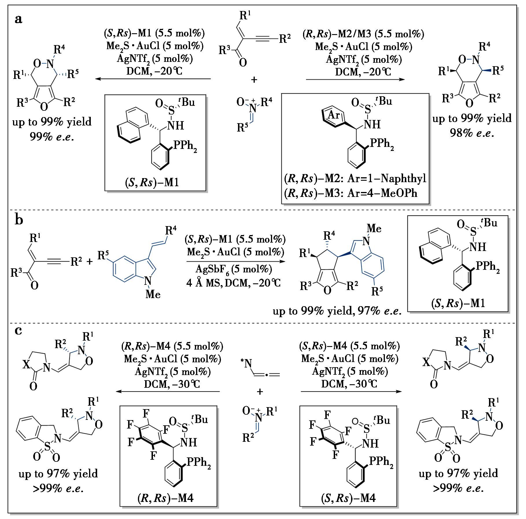a、b、c分别为烯炔酮与硝酮[5]、烯炔酮与3-苯乙烯基吲哚[7]、N-联烯酰胺与硝酮[8]的不对称环加成反应