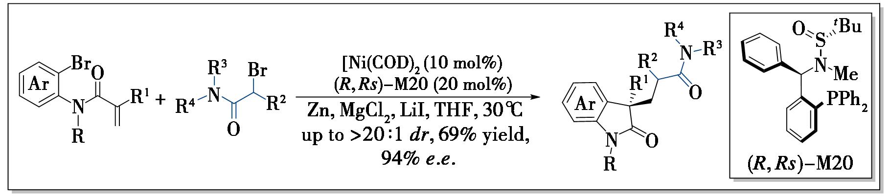 与单立体中心或1,2-相邻立体中心分子的不对称合成相比,通过单一催化剂同时构建非相邻的1,3-立体中心仍然是一个巨大的挑战。2024年,Kong等[43]以M20为配体,通过镍催化烯烃链状芳基溴化物与α-溴代酰胺的还原环化/交叉偶联反应,高对映选择性和非对映选择性地合成了一系列含1,3-非相邻立体中心的氧吲哚类化合物(图10)。研究表明,二级烷基亲电试剂的选择至关重要,若选用不当,易引发二聚化或自由基加成/环化等副反应。值得关注的是,此前发现的可加速金属还原剂对Ni(Ⅱ)还原的MgCl2,能显著提升该反应的非对映选择性。机理实验证实,反应中存在源自二级烷基亲电试剂的烷基自由基中间体,且排除了烷基锌作为转化关键中间体的可能性。通过X射线单晶衍射分析所制备的镍/Ming-Phos配合物发现,镍与磷、氧原子配位,且该配合物为反应的催化活性物种。作者提出的可能反应机理如下:芳基溴化物与手性Ni(0)物种发生氧化加成,经Zn还原生成芳基镍(Ⅰ)物种;该物种进一步与烯烃发生5-exo环化反应,生成σ-烷基镍(Ⅰ)物种;α-溴代酰胺向生成的Ni(Ⅰ)物种发生单电子转移,形成烷基自由基和Ni(Ⅱ)物种;镁盐通过与2个羰基的相互作用,将Ni(Ⅱ)中间体与烷基自由基连接,促进二者发生分子内重组,形成Ni(Ⅲ)中间体;在过量Zn存在下,Ni(Ⅲ)中间体被还原为Ni(Ⅱ)中间体,随后发生还原消除反应,生成目标产物并再生催化活性 Ni(0)催化剂。