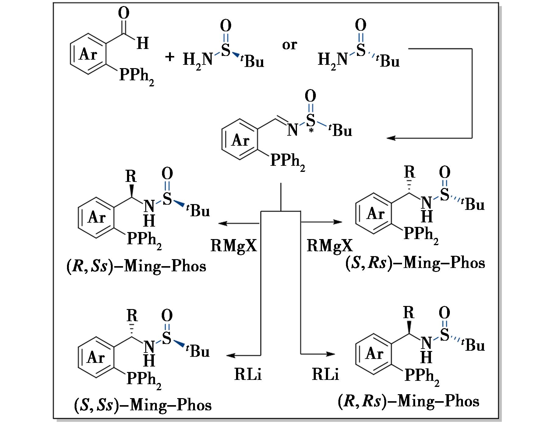 Ming-Phos配体(以张展鸣博士命名)是本课题组基于非C2对称性、刚柔并济及兼具软硬配位原子(O、S、N、P原子)的设计理念,成功开发的首类Sadphos(Sulfinamide Phosphine)配体。该配体的合成以商业可得的2-二苯基膦芳基甲醛为起始原料,先与叔丁基亚磺酰胺发生缩合反应生成亚胺,随后经金属试剂对亚胺进行加成反应,通过两步反应即可完成制备,且产物可通过柱层析或重结晶等常规方法便捷分离得到[1]。尤其值得注意的是,可以通过金属试剂的种类和叔丁基亚磺酰胺的构型来调控Ming-Phos配体4种构型的发散性合成(图1)。同时,因其结构多样性突出、修饰位点丰富及易于规模化制备等显著优势,Ming-Phos配体一经报道便受到广泛关注[2]。目前,该配体作为手性配体已成功应用于金、铜、银、钯、铑、镍等过渡金属催化的10余类不对称反应中,并在反应中展现出优异的催化活性与手性诱导能力。本文按照过渡金属的种类,综述了Ming-Phos配体在不对称催化反应以及聚合反应中的应用。