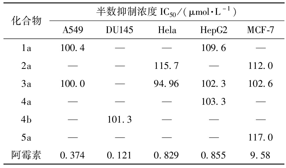 表1 化合物1a~5a对不同肿瘤细胞的半数抑制浓度注