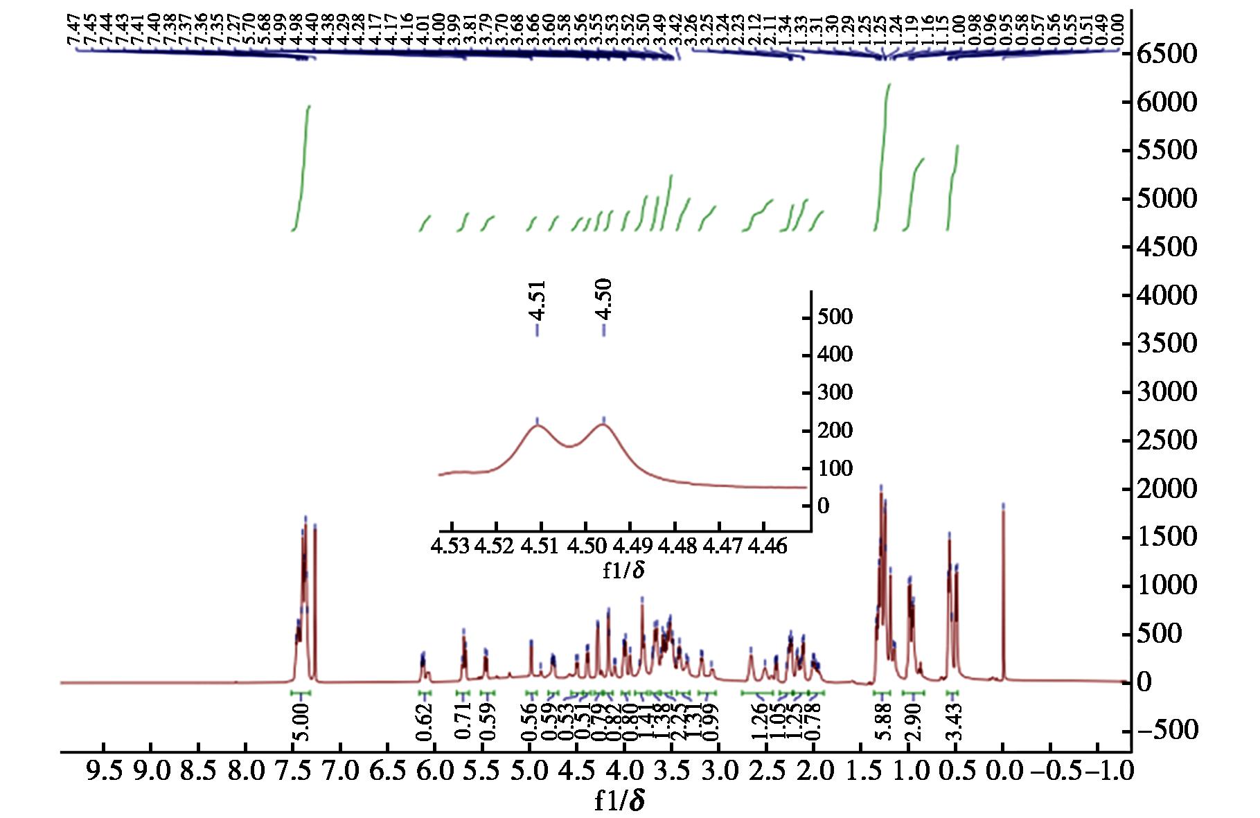 1HNMR(CDCl3,500 MHz),δ:7.47~7.32(m,5H);6.13(dt,1H,J=10.2,3.4 Hz);5.70(t,1H,J=9.4 Hz);5.47(d,1H,J=10.0 Hz);4.98(d,1H,J=5.0);4.75(dt,1H,J=10.4,3.5 Hz);4.50(d,1H,J=7.5 Hz);4.39(d,1H,J=7.5 Hz);4.28(d,1H,J=4.2 Hz);4.22~4.12(m,1H);4.03~3.95(m,1H);3.80(d,1H,J=10.6 Hz);3.68(t,1H,J=9.7 Hz);3.56~3.49(m,2H);3.45~3.31(m,1H);3.22~3.04(m,1H);2.59(d,1H,J=73.2 Hz);2.36~2.22(m,1H);2.20~2.06(m,1H);1.98(dq,1H,J=18.7,6.7 Hz);1.37~1.20(m,6H);0.97(dd,3H,J=16.4,6.8 Hz);0.59~0.49(m,3H)。13CNMR(CDCl3,126 MHz),δ:209.71,171.65,136.76,134.60,129.93,128.78,128.54,126.64,126.47,104.26,85.78,69.99,63.64,61.65,57.84,56.60,47.65,46.12,35.94,29.50,29.33,28.37,27.22,20.29,19.09,18.97,17.39。LC-MS(ESI),m/z(%):516.1(44.74)[M+H]+,538.1(100)[M+Na]+,514.2(4.68)[M-H]-,550.2(100)[M+Cl]-。HR-MS(ESI),C28H37NO8,实测值(计算值),m/z:538.240 4(538.241 7)[M+Na]+。