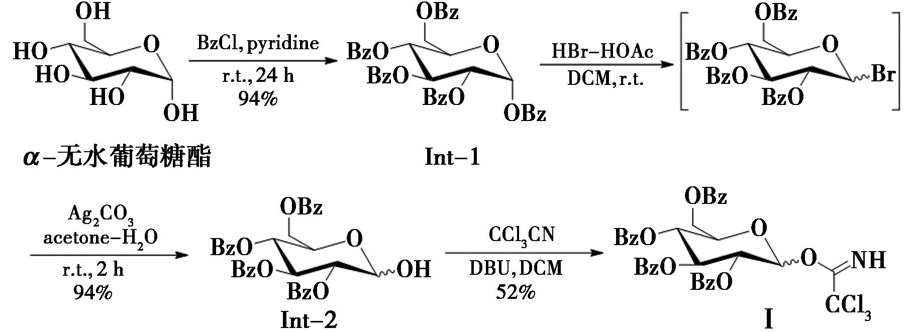将1 g(5.55 mmol)α-无水葡萄糖酯在15 mL无水吡啶中溶解,抽充氮气,置于冰浴冷却至 0 ℃,缓慢加入5.5 mL(47.5 mmol)苯甲酰氯,将混合物转至室温下搅拌过夜,然后用2 mL甲醇淬灭,真空蒸发溶剂,将粗产物溶于乙酸乙酯中,分别用HCl溶液、饱和NaHCO3溶液和食盐水洗涤,真空去除溶剂,粗产物经硅胶柱层析纯化,得到3.51 g白色固体Int-1,产率90%。