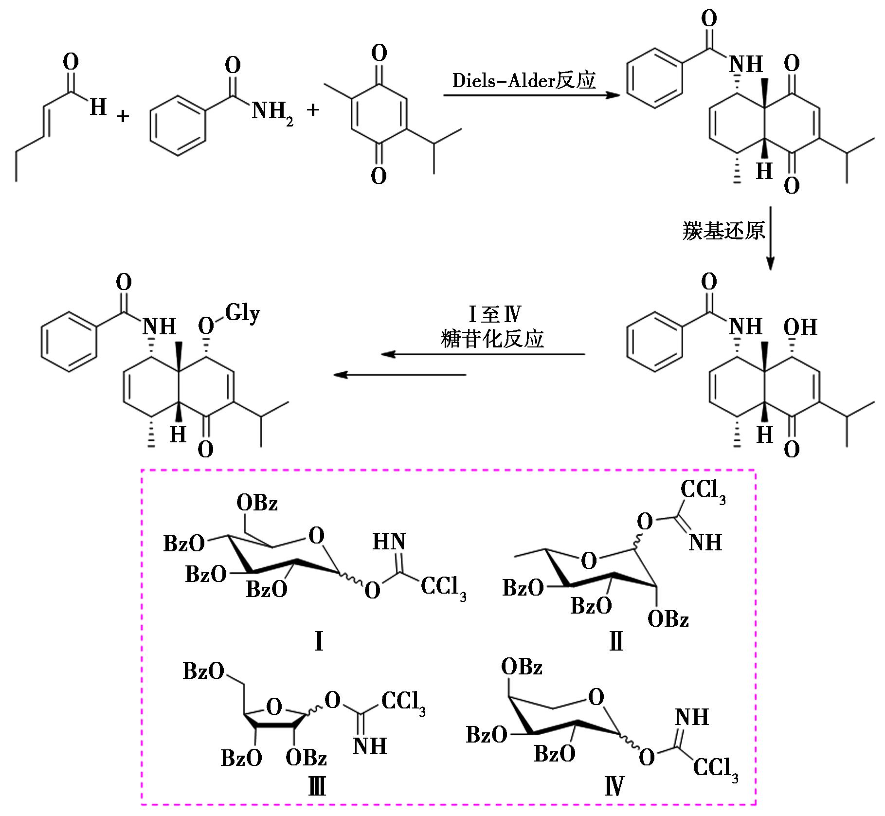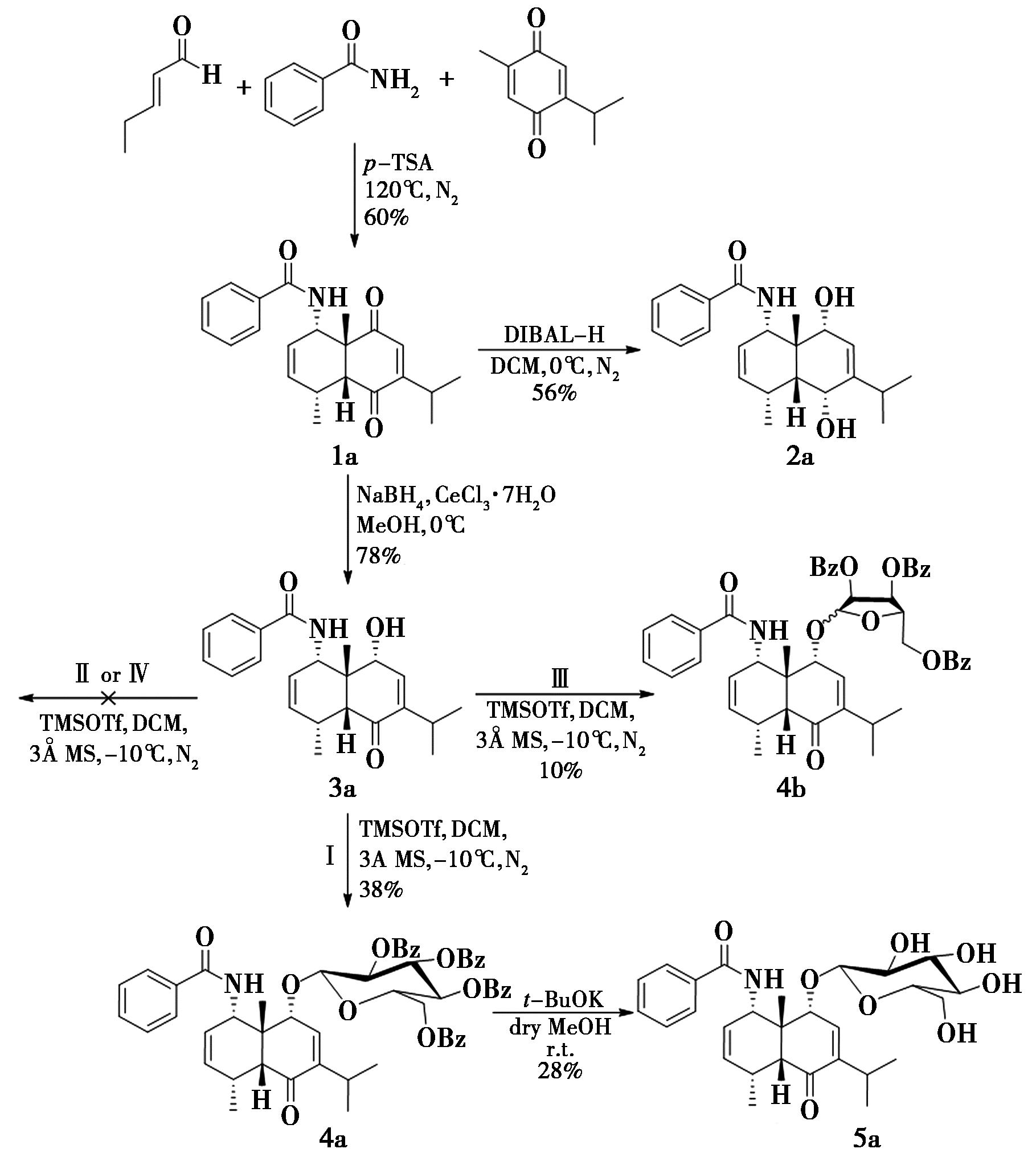 本文使用反式-2-戊烯醛、苯甲酰胺和百里醌作为起始原料,通过分子间的Diels-alder反应可以有效地合成桉烷型倍半萜骨架,且产率良好,这为构建桉烷型倍半萜骨架提供了可行的途径。随后,在合成桉烷型倍半萜衍生物的过程中,DIBAL-H可以有效还原化合物1a双环上的两个羰基。此外,通过合理的合成策略,成功制备了三氯乙酰亚胺酯糖基供体,并利用Schmidt糖苷化法将糖基引入到了桉烷型倍半萜骨架上,得到了相应的糖苷类衍生物4a、4b和5a。尽管产率有待提高,但这一研究为桉烷型倍半萜糖苷类衍生物的合成提供了新的途径和思路。