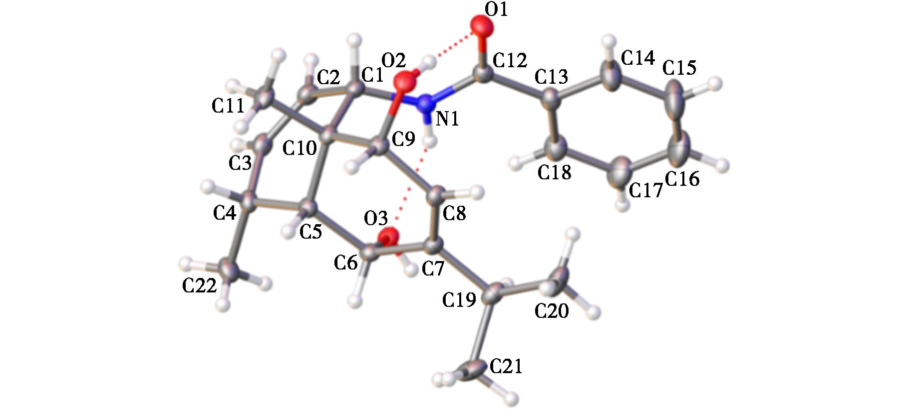 化合物2a晶体数据:化学式C22H29NO3(M=355.46 g/mol):单斜晶系,空间群P21/c(no.14),a=7.560 24(13) Å,b=13.122 2(3) Å,c=19.274 6(4) Å,β=91.515 5(16),晶胞体积 V=1 911.51(6) Å3,晶胞内分子数Z=4,数据采集温度T=293.15 K,铜靶辐射吸收系数μ(Cu Kα)=0.645 mm-1,计算密度=1.235 g/cm3,衍射点收集情况:公测量13 023个衍射点(8.152≤2θ≤153.078),独立衍射点3 845个(Rint=0.043 8,Rsigma=0.037 4)所有计算均使用这些独立点。结构精修结果R1=0.048 4(I>2σ(I)),wR2=0.152 9(使用全部数据)。