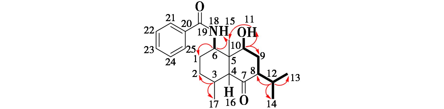 若采用硼氢化钠和氯化铈七水合物则以良好产率选择性还原C-10位羰基得到化合物3a。由 13CNMR谱中的δ 203.81和δ 167.50可看出该化合物含两个羰基,再结合 1HNMR谱以及 1H-1H COSY谱分析(图8),H-6(δ 4.18)与H-18(δ 9.30),H-9(δ 1.62~1.59)与H-10(δ 4.49~4.41),H-10(δ 4.49~4.41)与H-11(δ 3.89),H-11(δ 3.89)与H-15(δ 1.08)之间存在相关性,考虑到H-10与两个相邻的质子(H-9和H-11)都有相关性且H-11与H-15之间也存在较弱的相关性,以及存在两个羰基的信息,因此可以判断化合物3a的C-7位羰基未被还原为羟基(图9)。