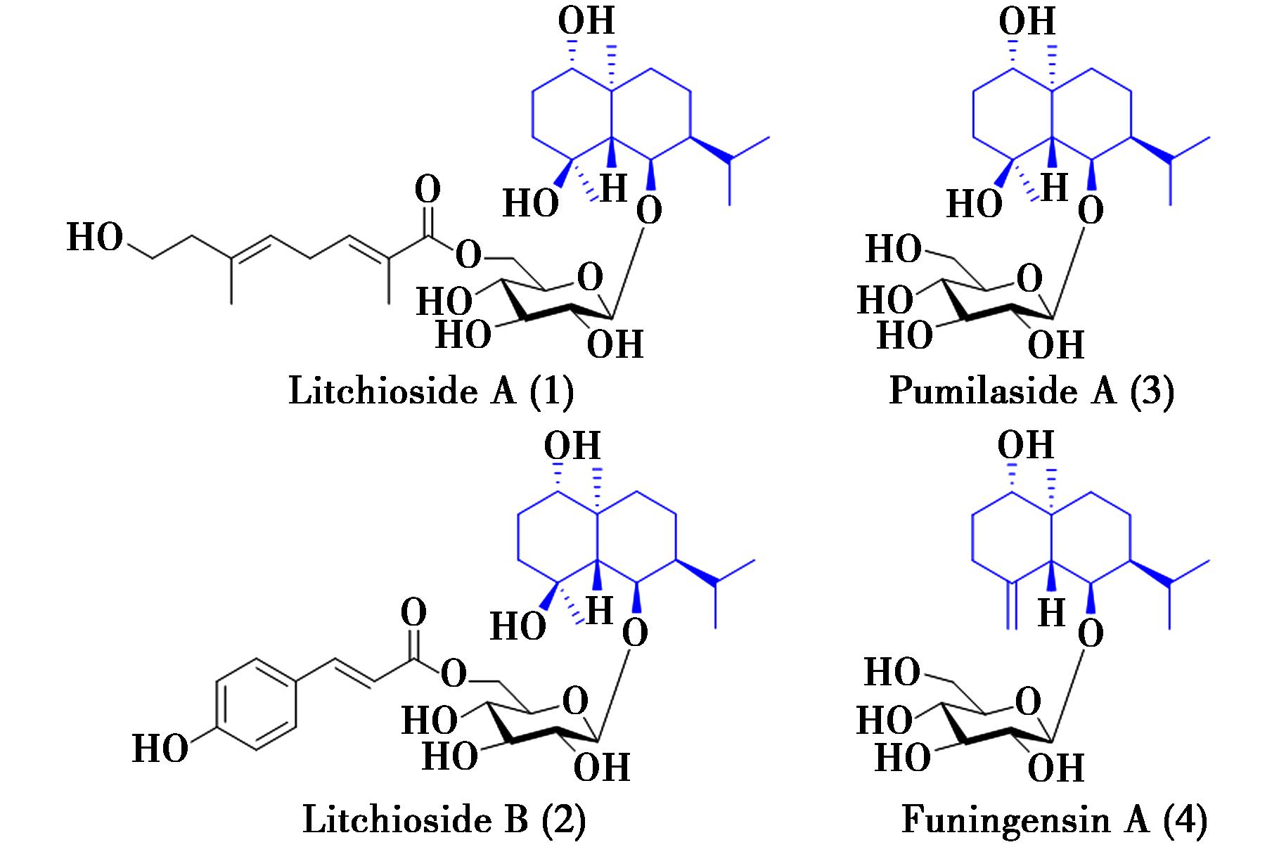 此外,研究表明,桉烷型倍半萜O-糖苷类化合物亦具有重要的抗肿瘤活性。例如,2010年,Xie等[15]从荔枝核中首次分离得到4个桉烷型倍半萜葡萄糖苷类化学成分:荔枝苷A(Litchioside A,1)、荔枝苷B(Litchioside B,2)、Pumilaside A(3)和Funingensin A(4),其中化合物1、2为全新的化学结构,化合物3、4是首次从荔枝核中分离得到的已知化合物(图2)。通过不同肿瘤细胞的活性测试发现:化合物3对人肺腺癌(A549)、肺癌(LAC)、宫颈癌(Hela)和肝癌(Hep-G2)等4种肿瘤细胞株均有很强的体外细胞毒活性,其半数抑制常数IC50值分别为:6.29、2.19、0.012、0.018 μmol/L,显示出广谱的抗肿瘤活性。而化合物4仅对肝癌Hep-G2细胞株有一定的活性(IC50为39.27 μmol/L),但与化合物3的活性相差较大。
