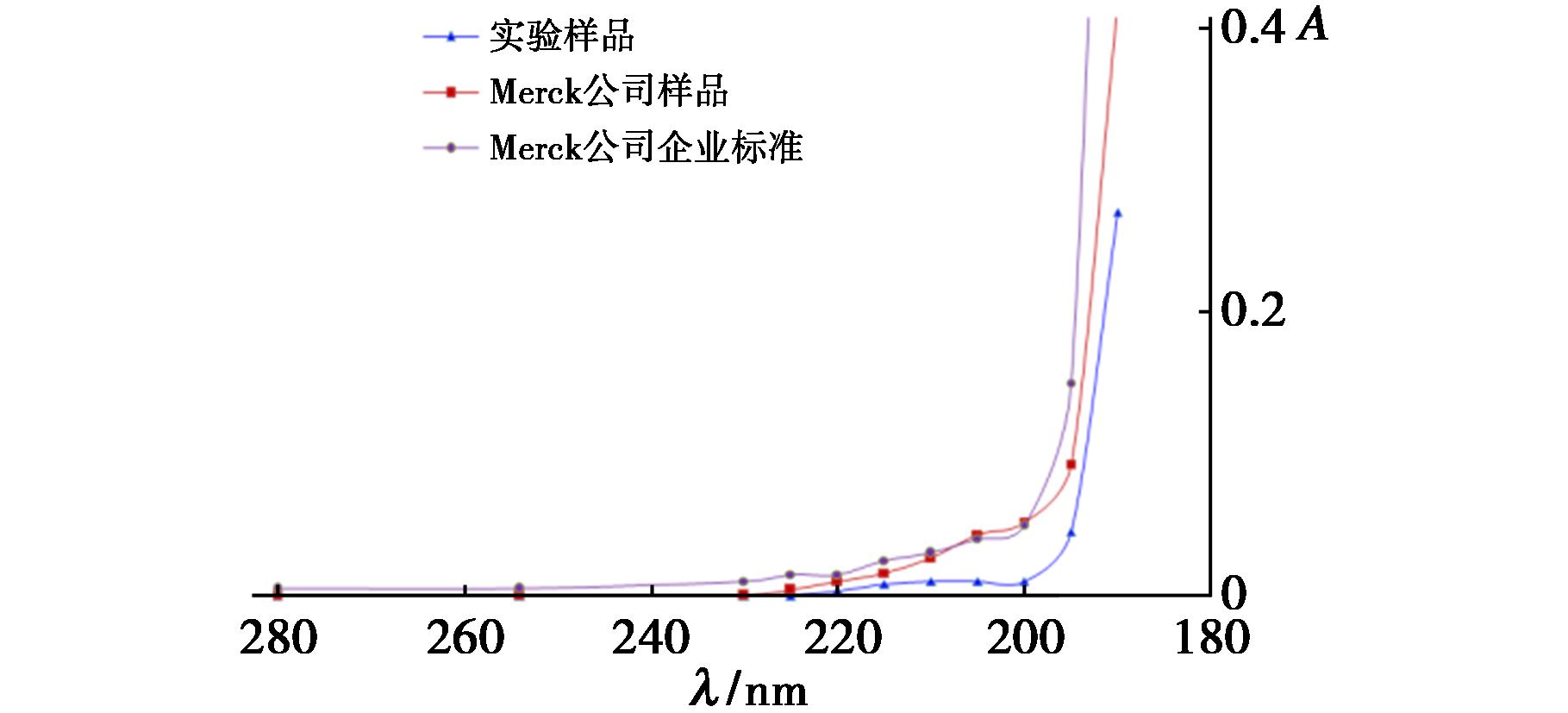 如表1所示,样品1和默克(Merck)公司的色谱纯乙腈相比,190~280 nm波长的吸光度相似,本实验所得乙腈经紫外检测(200~400 nm)显示无特征吸收,符合梯度色谱级标准。且样品1中的色谱纯乙腈在190~280 nm范围的吸光度更低。