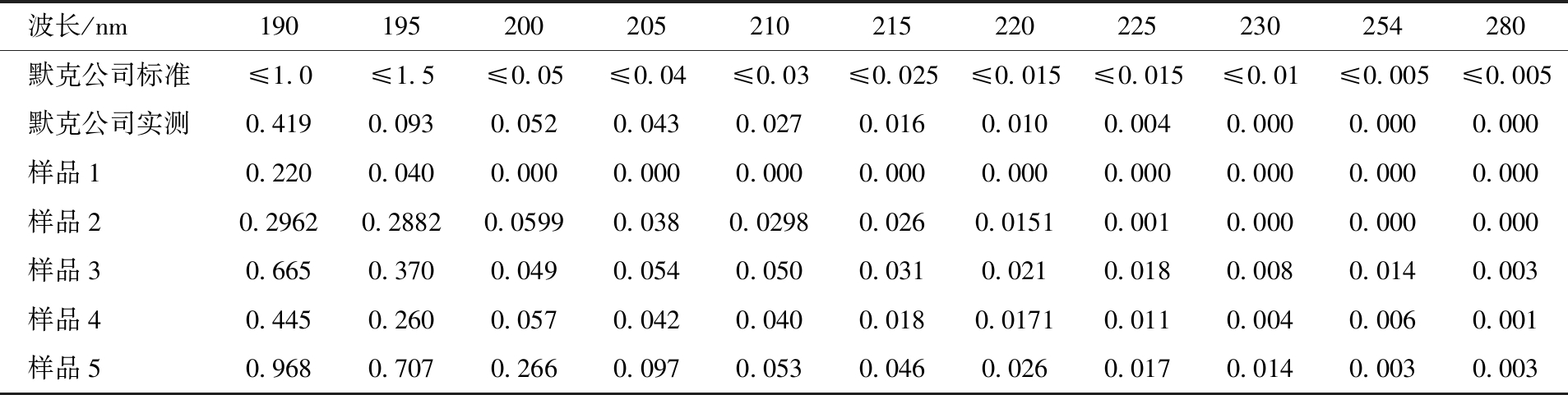 波长/nm190195200205210215220225230254280默克公司标准≤1.0≤1.5≤0.05≤0.04≤0.03≤0.025≤0.015≤0.015≤0.01≤0.005≤0.005默克公司实测0.4190.0930.0520.0430.0270.0160.0100.0040.0000.0000.000样品10.2200.0400.0000.0000.0000.0000.0000.0000.0000.0000.000样品20.29620.28820.05990.0380.02980.0260.01510.0010.0000.0000.000样品30.6650.3700.0490.0540.0500.0310.0210.0180.0080.0140.003样品40.4450.2600.0570.0420.0400.0180.01710.0110.0040.0060.001样品50.9680.7070.2660.0970.0530.0460.0260.0170.0140.0030.003