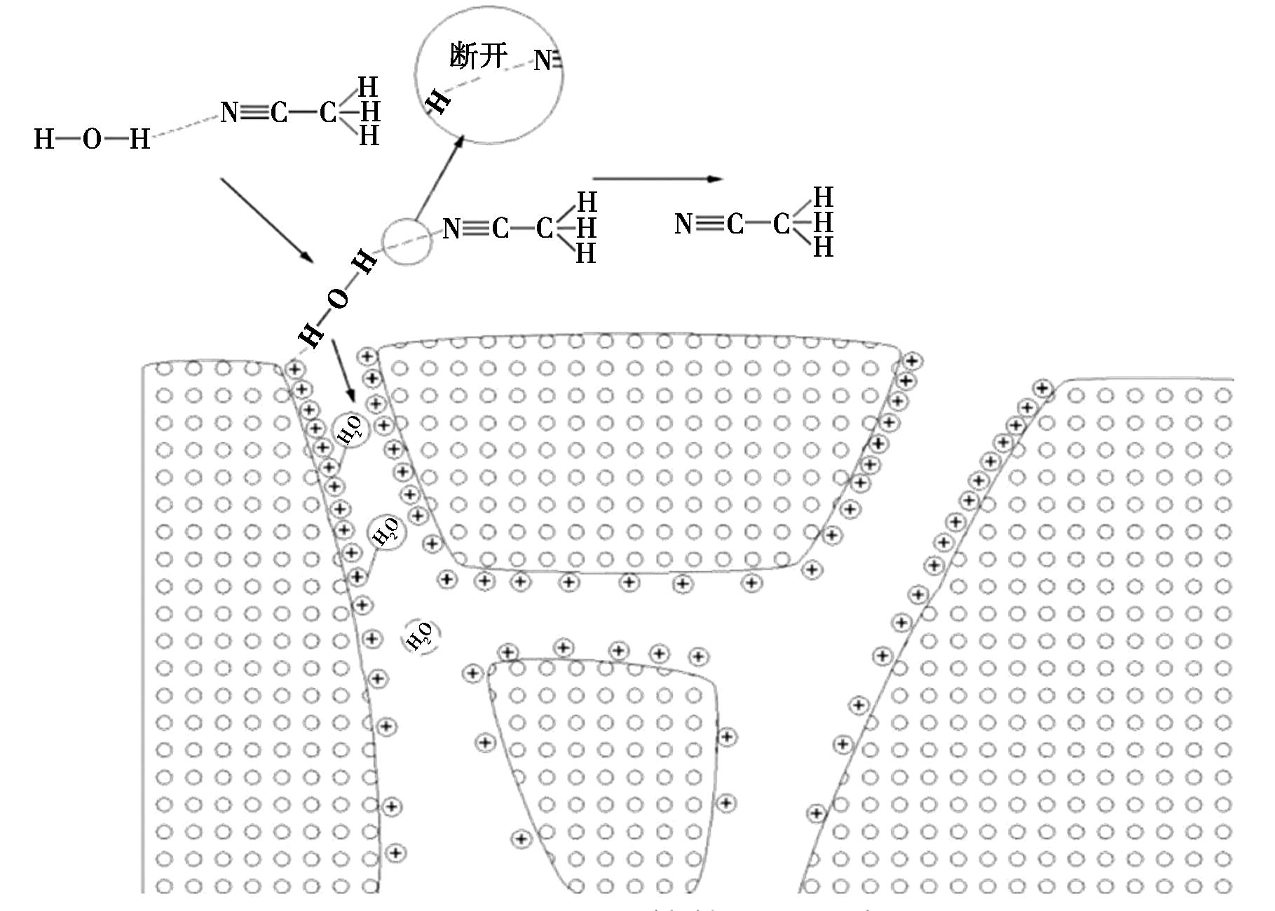 乙腈(CH3CN)分子中,氮原子电负性较高,C≡N呈现一定极性。但C—H键极性较弱,C≡N中N原子的电子云被吸引,N原子的电子云偏移使N显示出部分负电荷性,氮原子上的孤对电子能够与水分子中O—H键的氢形成N…H—O型的类似氢键的缔合[18,19]。