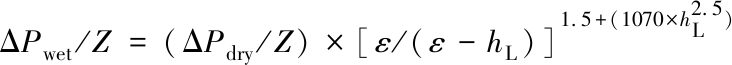 式中:ΔPwet/Z为湿填料单位高度压降,kPa/m;ΔPdry/Z为干填料单位高度压降,Pa/m;hL为持液量;ε为填料孔隙率。