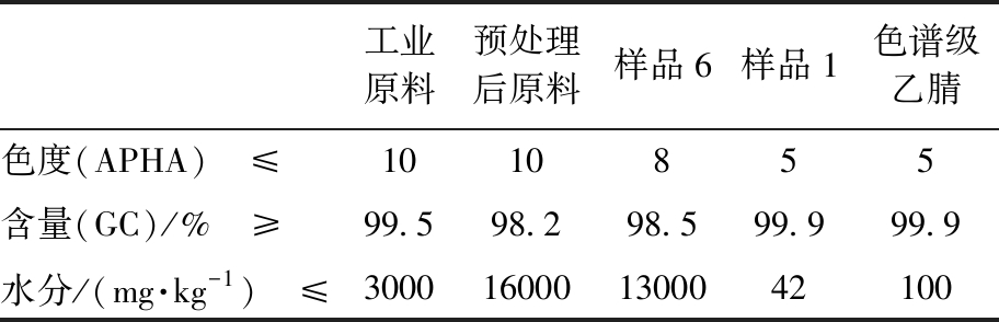 工业原料预处理后原料样品6样品1色谱级乙腈色度(APHA) ≤1010855含量(GC)/% ≥99.598.298.599.999.9水分/(mg·kg-1) ≤3000160001300042100