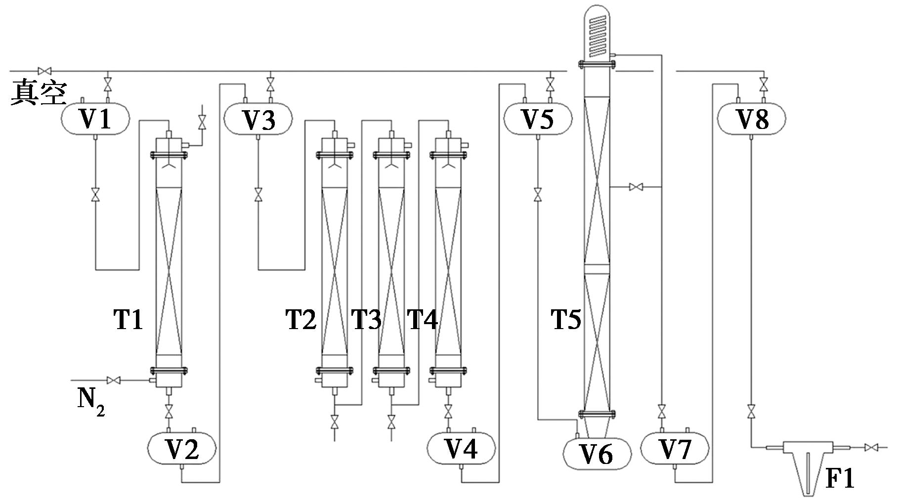 T1.氧化中和柱;T2.活性炭吸附柱;T3、T4.分子筛吸附柱;T5.精馏柱;V1.原料罐;V2、V3、V4、V5.中间成品罐;V6.精馏塔釜;V7.成品罐;V8.分装罐;F1.过滤器