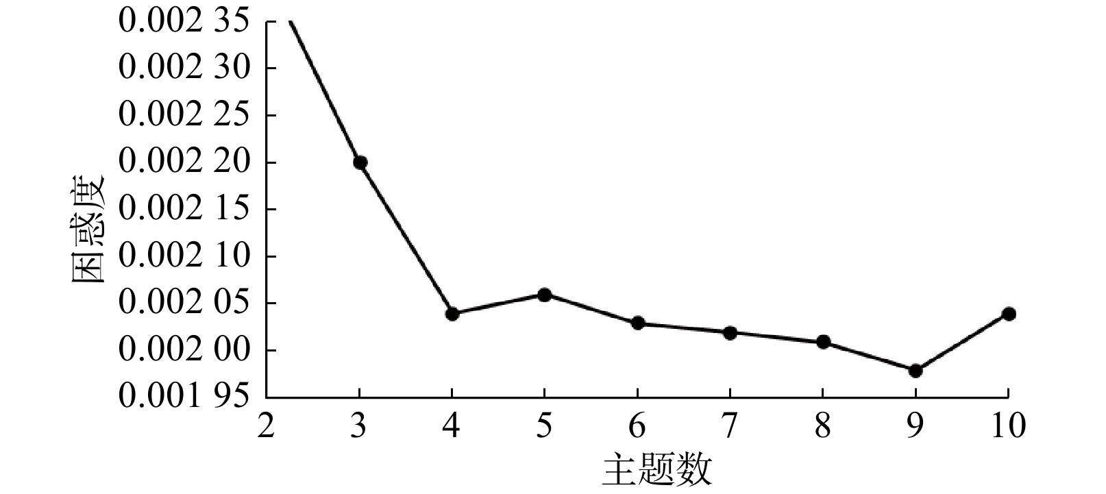 表 1 “贵州村超”官方抖音账号评论文本高频词Table 1 High-frequency words in comments on the official "Guizhou Cun Chao" Douyin account序号 词项 TF-IDF 序号 词项 TF-IDF 序号 词项 TF-IDF 1 球员 0.011 040 11 进球 0.003 281 21 小瑞村 0.002 032 2 直播 0.005 946 12 球场 0.003 247 22 水平 0.002 026 3 冠军 0.004 233 13 流量 0.003 200 23 节目 0.002 002 4 守门员 0.003 844 14 文化 0.003 092 24 资本 0.001 921 5 好吃 0.003 644 15 民族 0.002 775 25 村长 0.001 860 6 国足 0.003 564 16 表演 0.002 644 26 职业 0.001 791 7 足协 0.003 384 17 卡卡 0.002 627 27 云南 0.001 739 8 球队 0.003 380 18 香港 0.002 326 28 格局 0.001 682 9 县长 0.003 336 19 中超 0.002 303 29 精神 0.001 635 10 世界杯 0.003 322 20 美食 0.002 254 30 旅游 0.001 630 (2)LDA 主题模型训练与评估。本研究在对语料库进行预处理(包括分词、去停用词、词频统计及词向量化处理)后,采用Python语言中的sklearn库以构建LDA模型,从而识别文章的主题信息。在模型训练与评估过程中,确定主题数是影响模型表现的关键步骤。为了科学合理选择主题数,常采用困惑度分析(图1),其一般用于评估LDA主题模型的优劣程度,其值低表明模型泛化能力强[20]。
