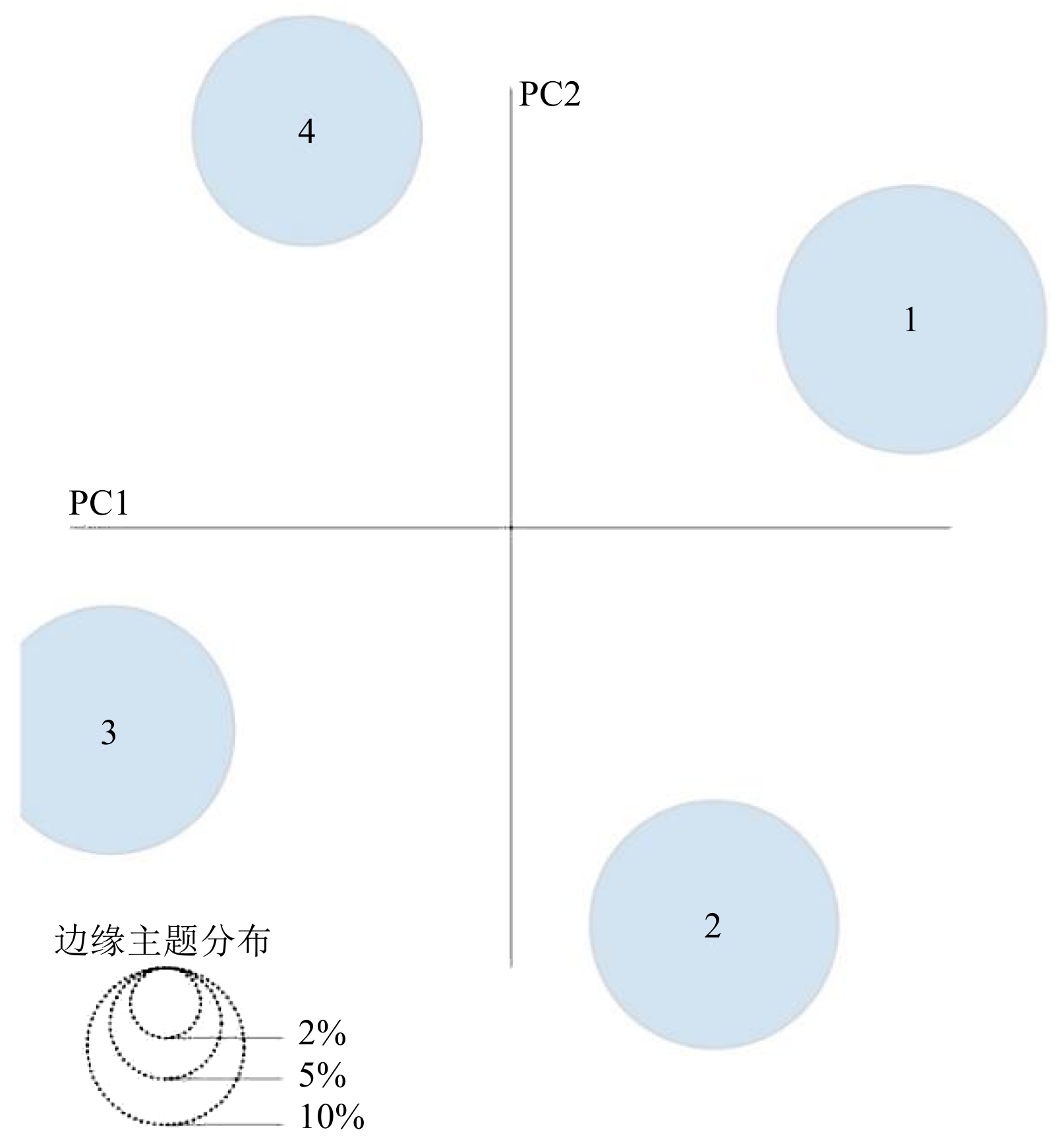 基于困惑度分析,对主题数为4~9逐一分析,发现当主题数为4时,各主题语义清晰,可解释性更强,生成较好的LDA主题模型,因此选择主题数为4。主题内的词项与主题的关联度通过pyLDAvis中λ参数进行调节,将λ=0.6(0≤λ≤1)作为本研究主题聚类结果的参考值[21],各主题间均无相互重叠,说明主题模型生成比较理想,能够较好地反映研究语料所蕴含的核心议题(图2)。表2显示了每个主题包含的前10个词项。