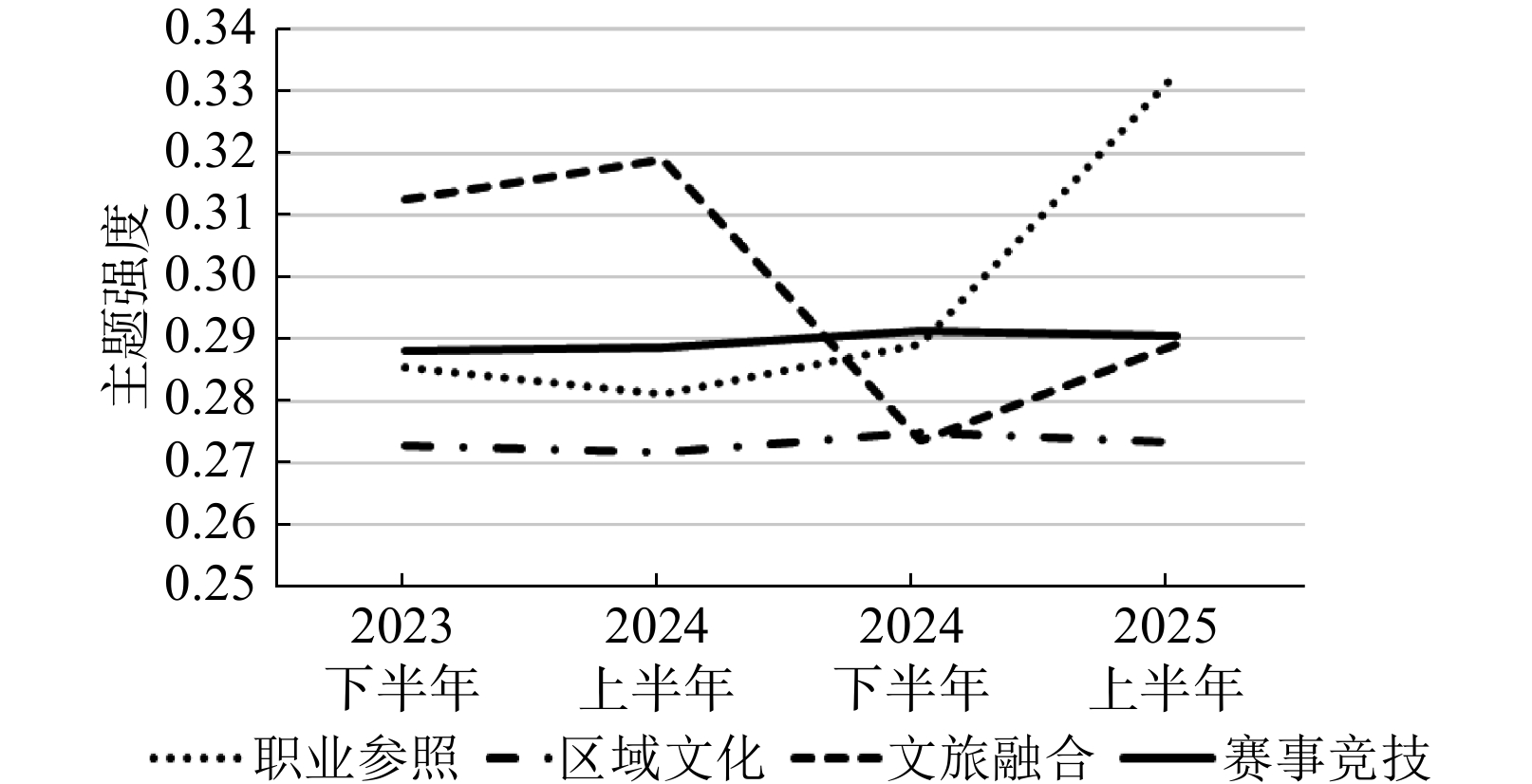 时间 职业参照 区域文化 文旅融合 赛事竞技 2023年下半年 0.285 496 0.272 837 0.312 501 0.287 980 2024年上半年 0.281 153 0.271 774 0.319 095 0.288 722 2024年下半年 0.289 203 0.274 861 0.273 528 0.291 239 2025年上半年 0.332 847 0.273 245 0.289 274 0.290 544 -