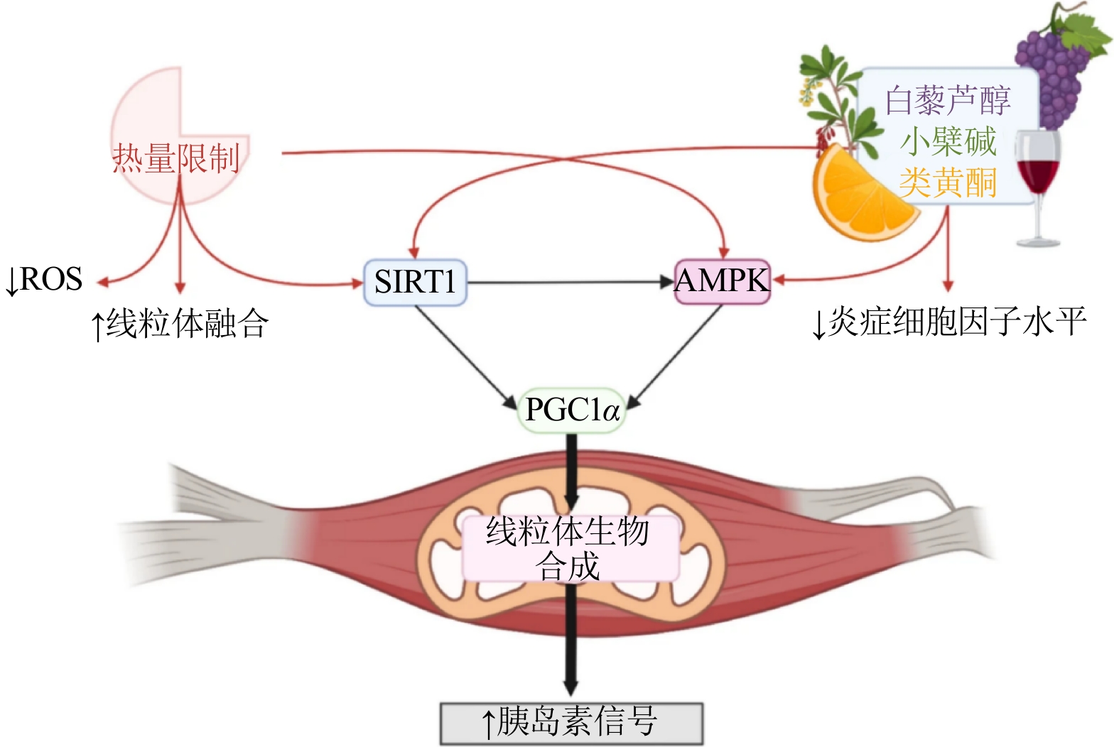 众所周知,运动和饮食策略均可独立促进线粒体健康。新出现的证据表明,当两者结合时,可以通过重叠和独特的机制产生协同作用,效果优于单独使用任一方法[61]。具体而言,运动通过增加机体对ATP和代谢底物的需求来刺激线粒体更新,而饮食干预有助于改善底物利用率、优化氧化还原状态,进而增强线粒体功能能力。在高脂饮食诱导的肥胖动物模型中,运动结合饮食调整不仅能恢复线粒体含量,还可提高线粒体偶联效率,减少ROS的产生[62-63]。这种潜在的协同效应可能源于AMPK、SIRT1和PGC-1α等关键信号通路的放大激活,以及线粒体动力学(如裂变、融合和线粒体自噬)的改善[64]。