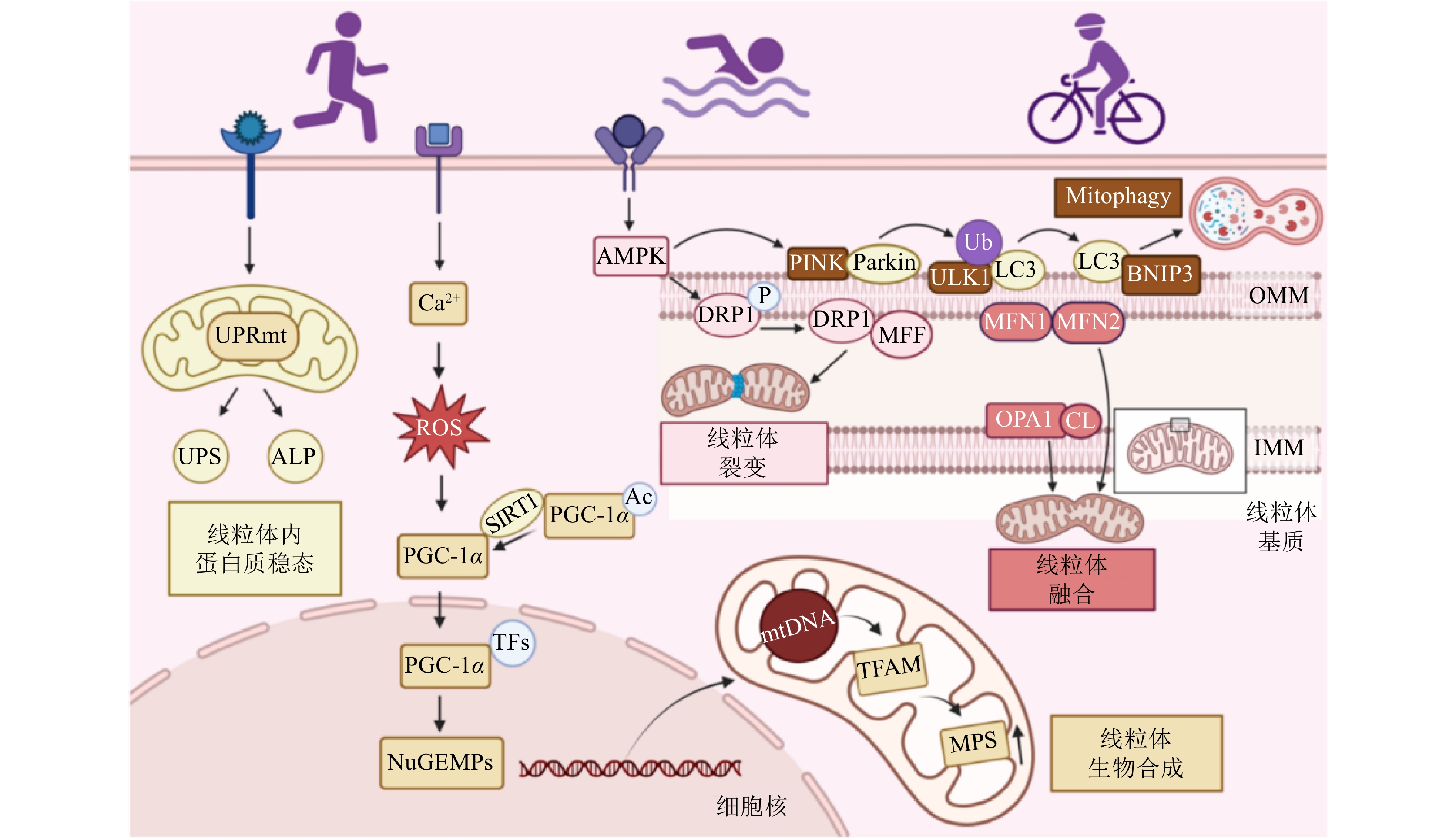 线粒体是双层膜结构的细胞器,作为细胞能量生产的主要场所,通过氧化磷酸化发挥作用。这些细胞器在生成三磷酸腺苷(Adenosine Triphosphate, ATP)中发挥基础作用,ATP是维持细胞功能和稳态所必需的能量“货币”[1]。线粒体通过三羧酸循环(Tricarboxylic Acid, TCA)代谢碳水化合物、脂肪和蛋白质的底物,为电子传递链提供电子以合成ATP[2]。由于其高能量需求,骨骼肌、心脏和大脑等组织的线粒体密度较高,凸显了其在维持生理过程中的重要性[3]。除了能量代谢外,线粒体还调节关键的细胞功能,包括活性氧(Reactive Oxygen Species, ROS)的产生、钙稳态和细胞凋亡,因此其完整性对整体健康至关重要[4]。