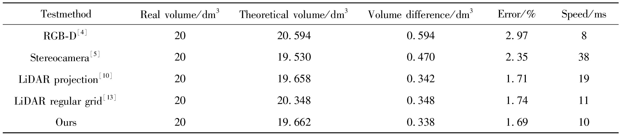 TestmethodReal volume/dm3Theoretical volume/dm3Volume difference/dm3Error/%Speed/msRGB-D[4]2020.5940.5942.978Stereocamera[5]2019.5300.4702.3538LiDAR projection[10]2019.6580.3421.7119LiDAR regular grid[13]2020.3480.3481.7411Ours2019.6620.3381.6910