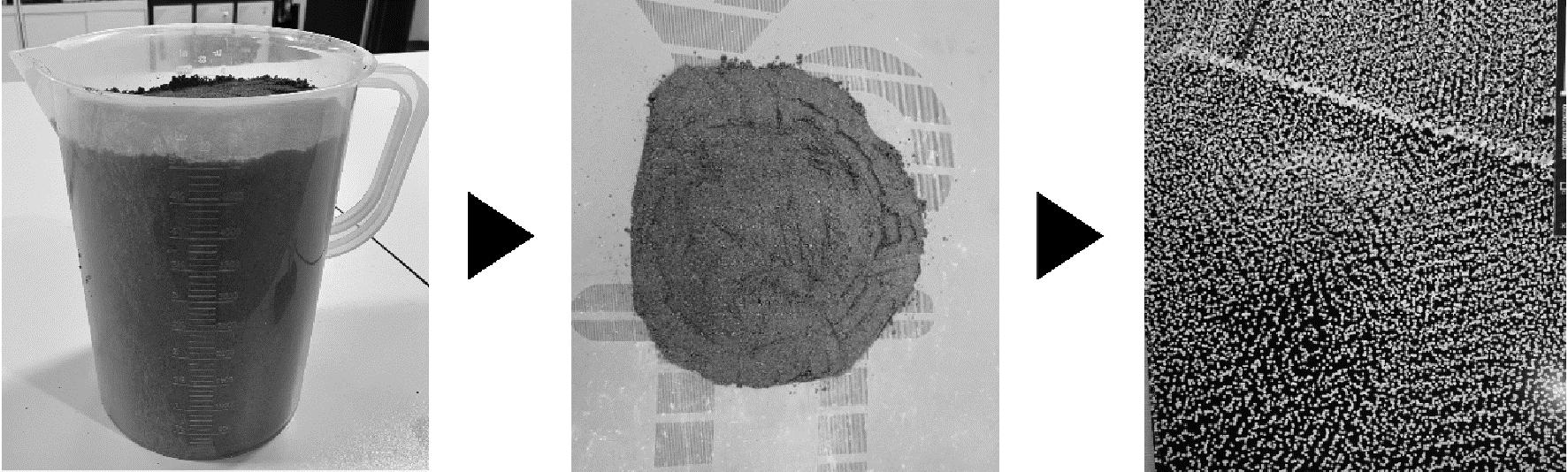 为了验证算法性能,在实验室环境搭建了模拟料堆,对其体积进行测量,记录实验结果,并与料堆真实体积进行对比,计算出准确率。本实验选用黄沙作为测试物料,并采用量杯作为标准计量设备。首先用量杯取一定体积的黄沙,将其堆放于光滑平板上并修整形态,使其与生产现场料堆的形状相似;其次,将LiDAR通过支架安置于料堆正上方,使激光束垂直扫描料堆表面,以获取点云数据;最后,利用算法处理采集的数据,计算得到料堆的理论体积值。实验过程如图 9所示。